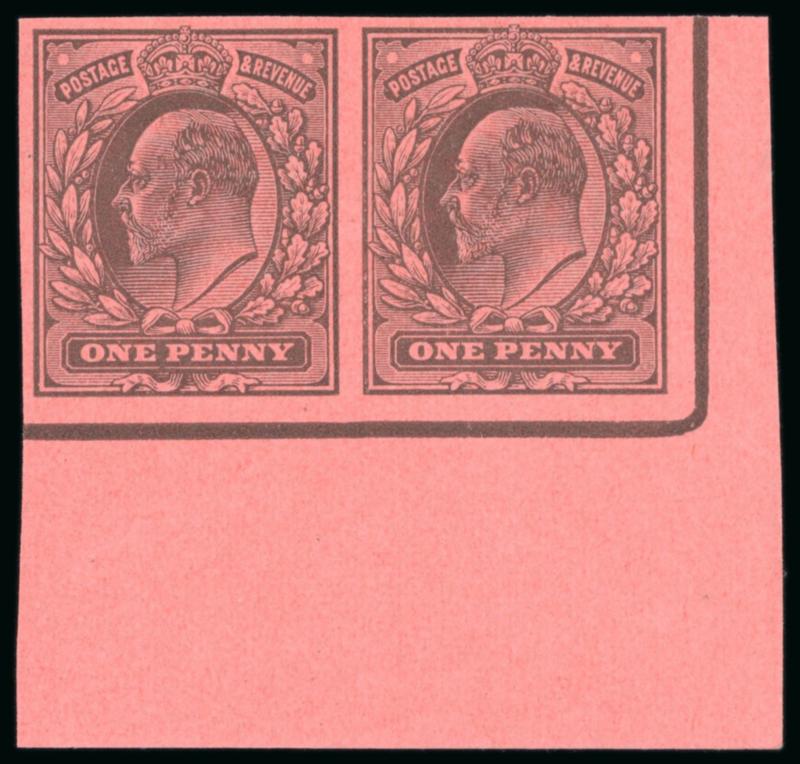 1901 1d Colour trial imperf. horizontal pair from the lower right of the sheet, printed in black on red gummed crown watermark paper made from a special plate of 20 Electros, o.g. with small trace of a hinge, the usual light gum wrinkles, a scarce multiple.
