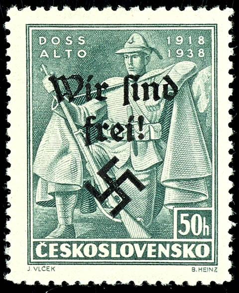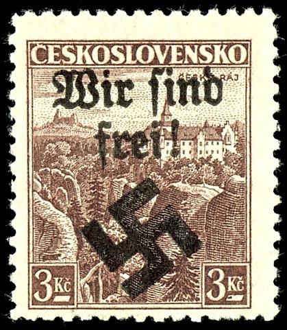 25 Heller postal stamp with hand stamp overprint "we are free! plus swastika", cancelled "Liberec 10.10.38" on unmailed card, very fine, issued only 200 examples, photo expertize Brunel VP "the condition is perfect. ", Michel 80.- (14) (page)