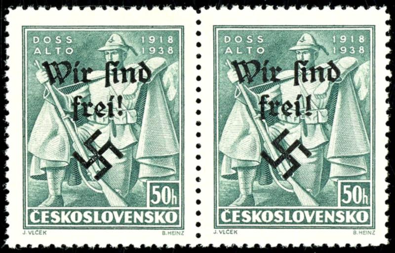 50 H. stamp exhibition Pilsen with hand stamp overprint "we are free! plus swastika" in the horizontal gutter pair with lower margin, neat cancelled with cancel of liberation "Liberec day the liberation 10.10.38", with original gum and small hinge trace only in the lower margin, edition 200 pieces -
