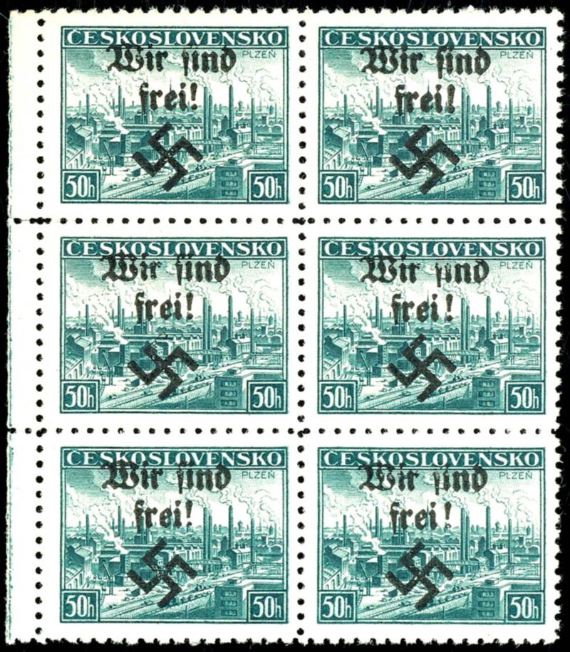 50 H. Pilsen in the horizontal gutter pair, hand stamp overprint "we are free! plus swastika", cancelled by special cancel Liberec on piece, expertized Mahr BPP, Michel 300.-50 H. Pilsen in the horizontal gutter pair, hand stamp overprint "we are free! plus swastika", cancelled by special cancel Lib