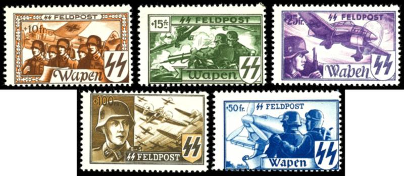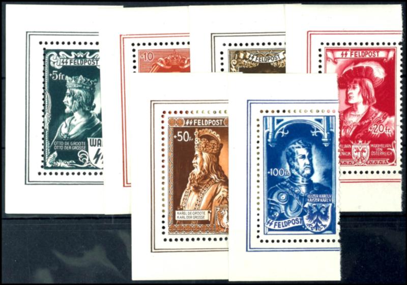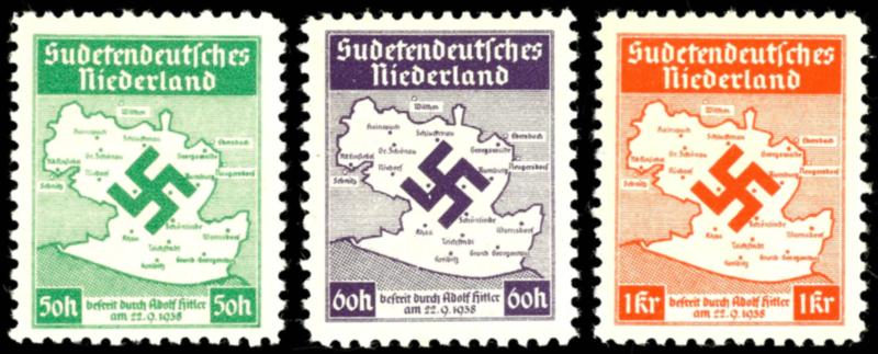 50 h. to 2 Kc. Fuegner each with hand stamp overprint "we are free! plus swastika", each with special cancel "Liberec 1 German Reichspost eighth of October 1938 Heil Hitler! " on faultless letter pieces, edition 200 sets, photo expertize Brunel BPP (2007) "the condition is perfect. ", Michel 1050.-
