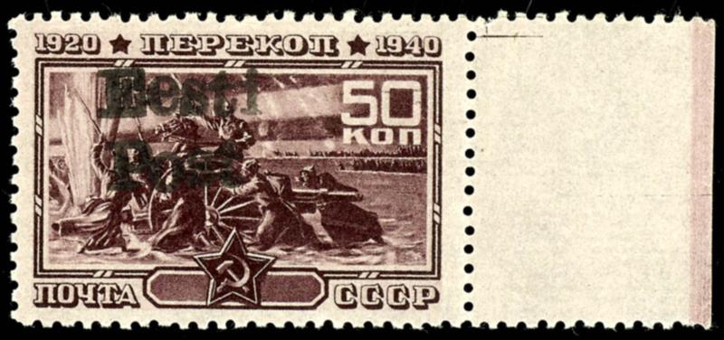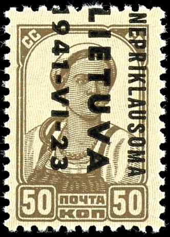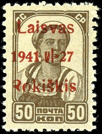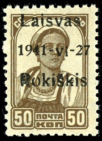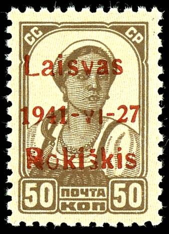 50 Kopecks postal stamps with brown red overprint "Laisvas 1941 - VI - 27 Rokiskis" in type I, overprint flaw IV "small close V and large I by month indication VI" (field 10), mint never hinged, very fine, unsigned, photo expertize Prof. Dr. Udo E. Klein VP "genuine and immaculate", Michel 540.- (6b