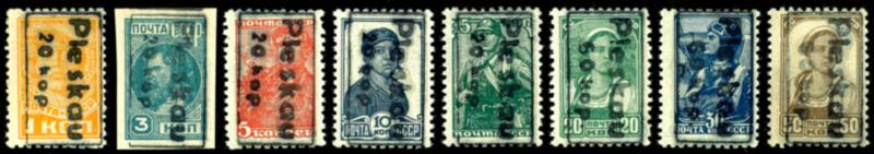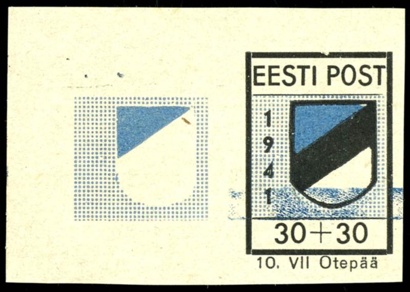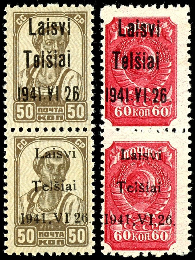 5 Kopecks to 60 Kopecks postal stamps with black typography overprint "Laisvi Telsiai 1941. VI. 26" in type I and III as vertical type pairs, the upper stamp in type III with overprint flaw XXII "second i in Telsiai broken", complete set with seven values, mint never hinged, very fine, expertized Kr