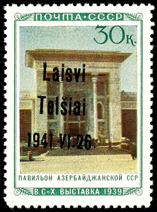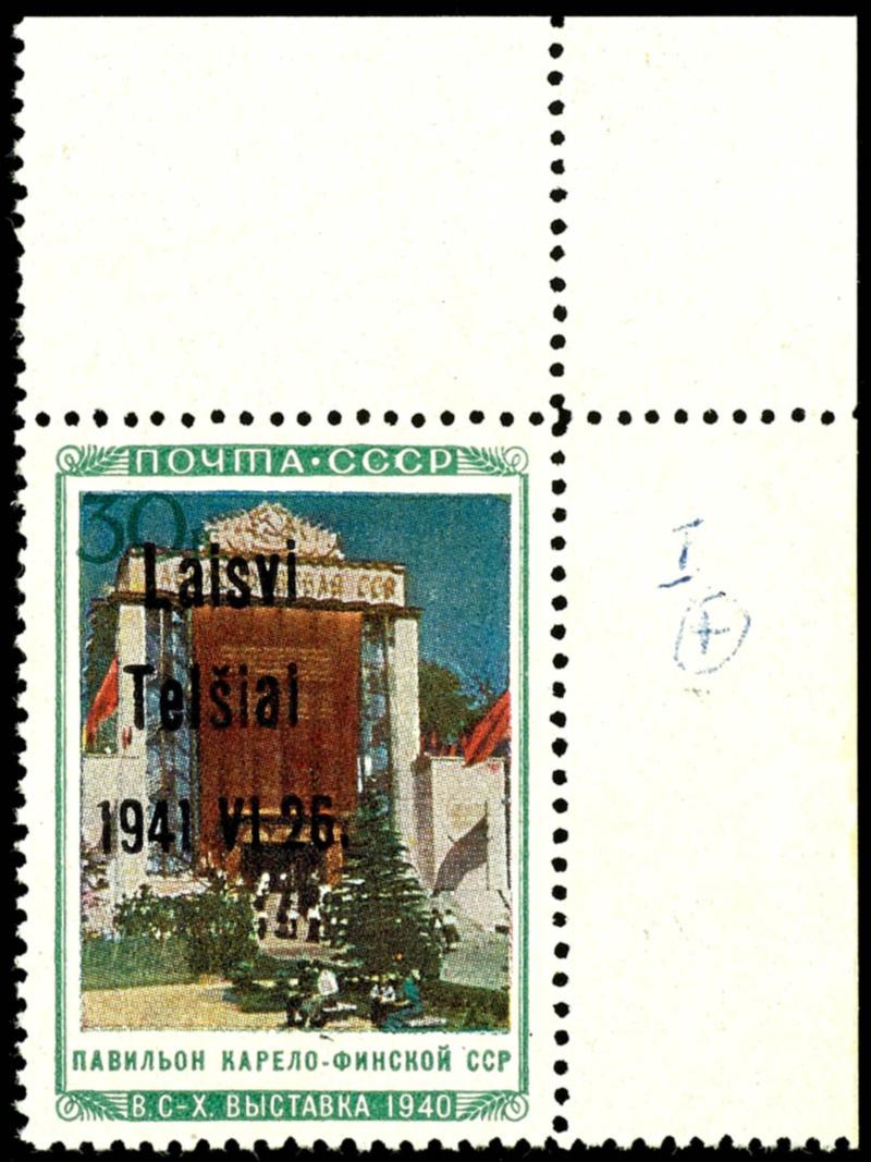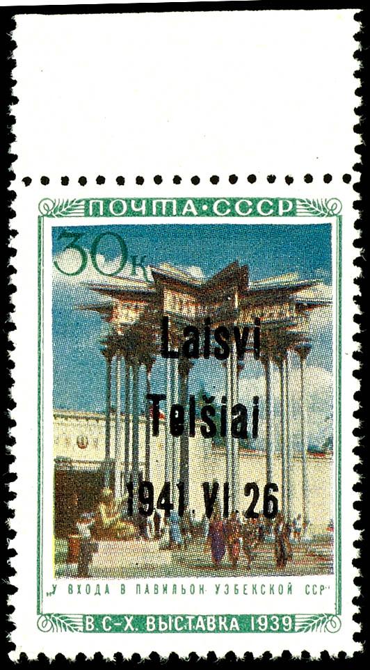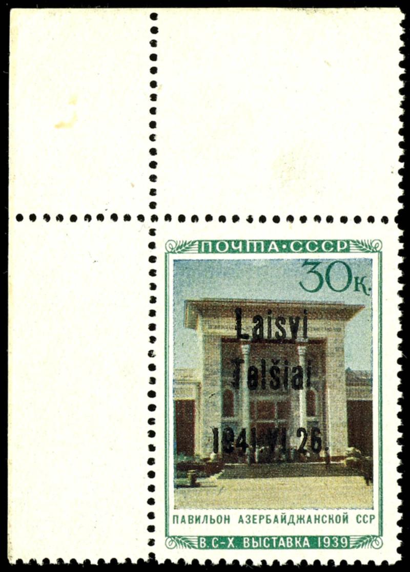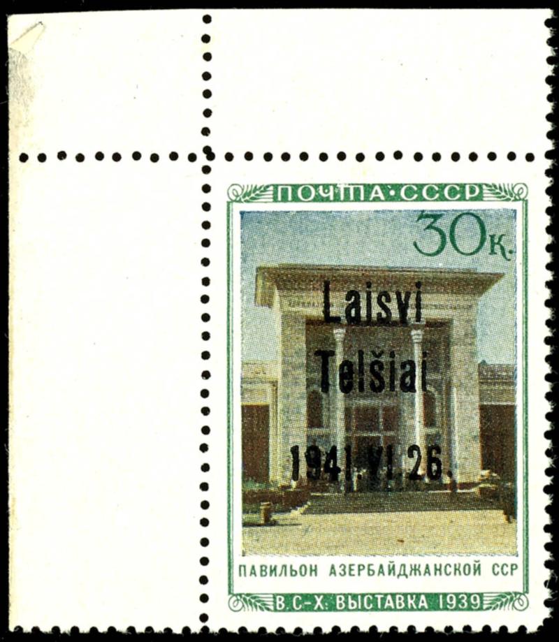 30 Kopecks special stamp "agriculture exhibition - Azerbaijan SSR" with black typography overprint "Laisvi Telsiai 1941. VI. 26" in type IIIb the 2nd issue, overprint flaw XXII "l in Telsiai broken", corner margin piece top left, mint never hinged, very fine, issued only 40 examples, unsigned, photo