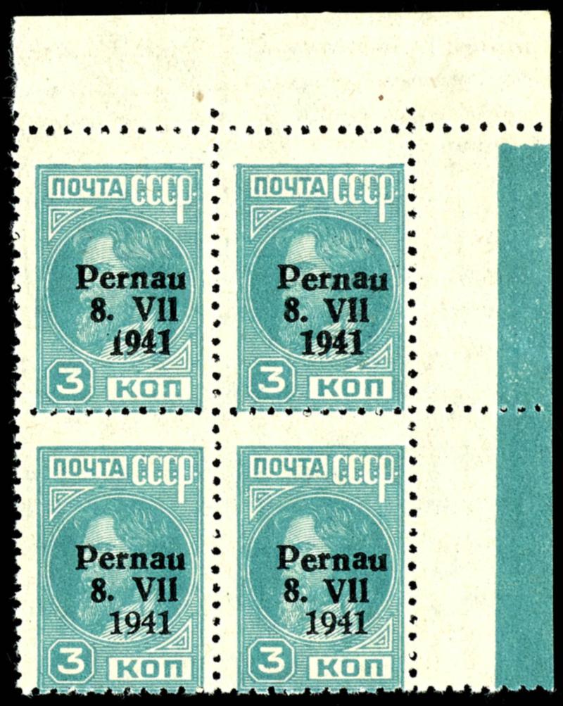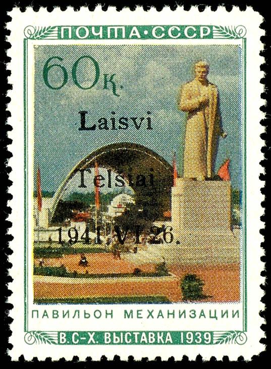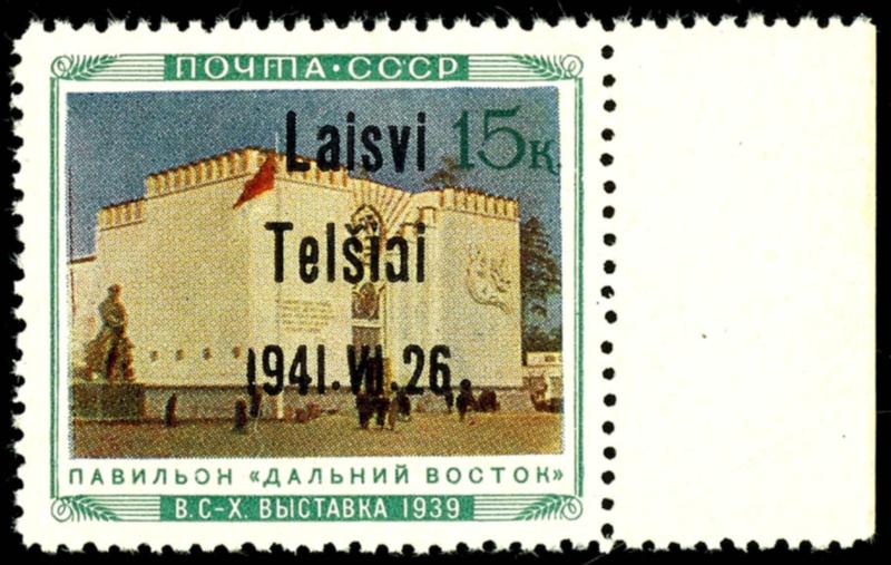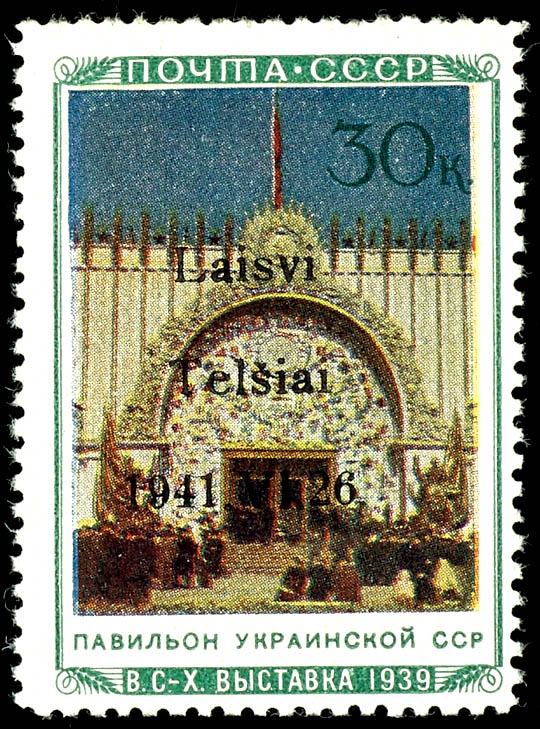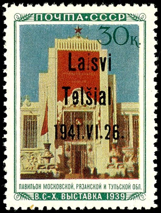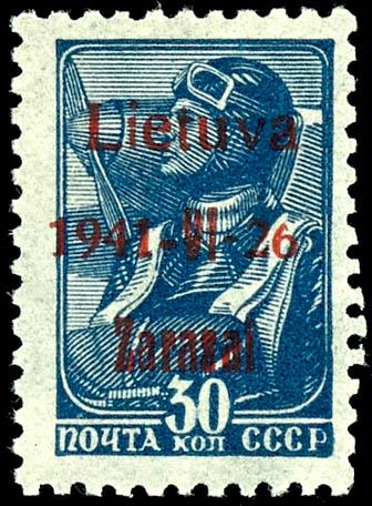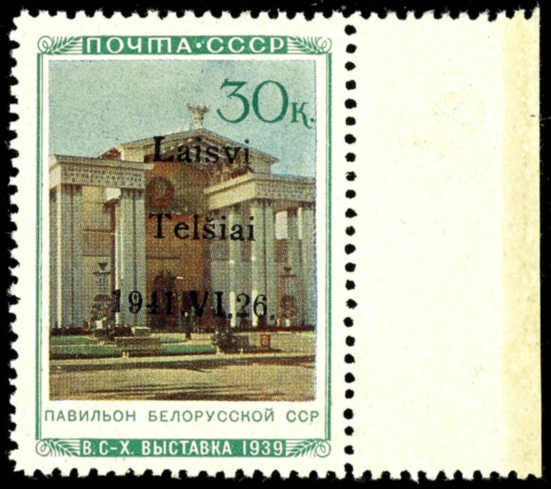 30 Kopecks special stamp "agriculture exhibition - Azerbaijan SSR" with black typography overprint "Laisvi Telsiai 1941. VI. 26" in type IIIb the 2nd issue, overprint flaw XXII "l in Telsiai broken", corner margin piece top left, mint never hinged, very fine, issued only 40 examples, unsigned, photo