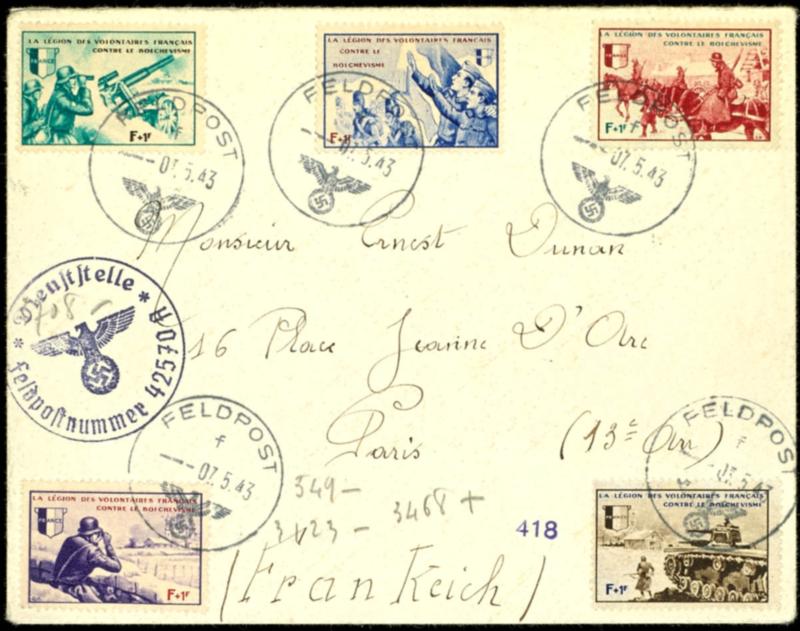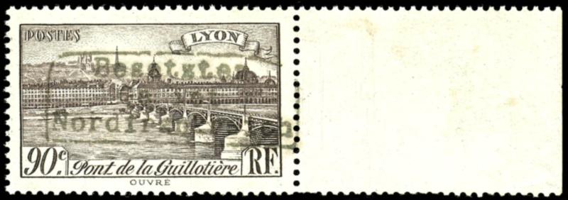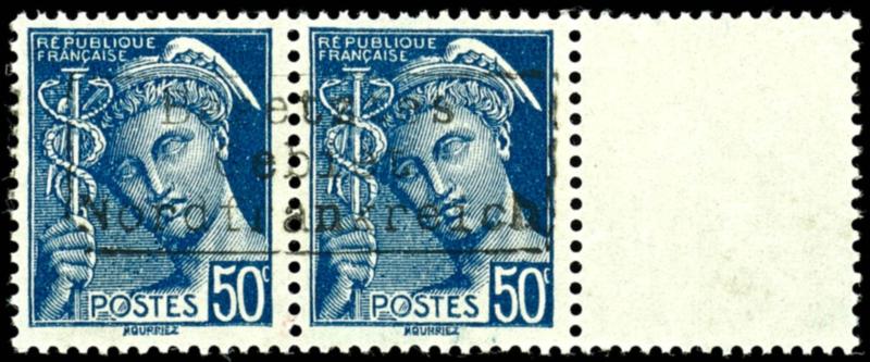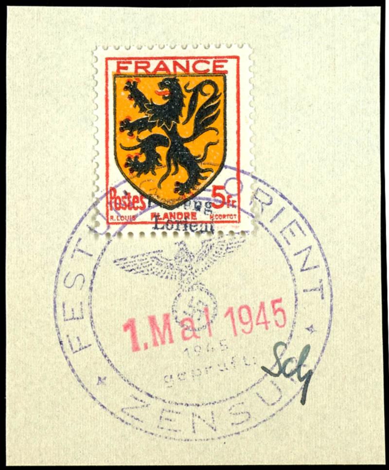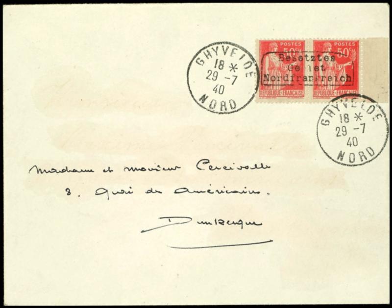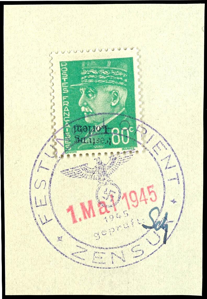 50 H. Vouziers with hand stamp overprint "we are free! plus swastika" with right attaching ornamental field and right margin of sheet, on faultless letter piece with full cancel of liberation 10.10.38, expertized Mahr BPP as well photo expertize Brunel VP (2020) "the condition is perfect. pieces wit