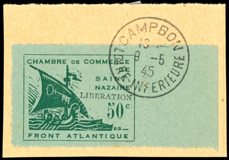 50 H. triangle stamp in red with hand stamp overprint "we are free! plus swastika", perforation A, neat cancelled on piece, issued only 100 piece, signed Dr. Hoerr and photo expertize Brunel VP (2012) "the condition is perfect. ", Michel 500.- (45A) (page)