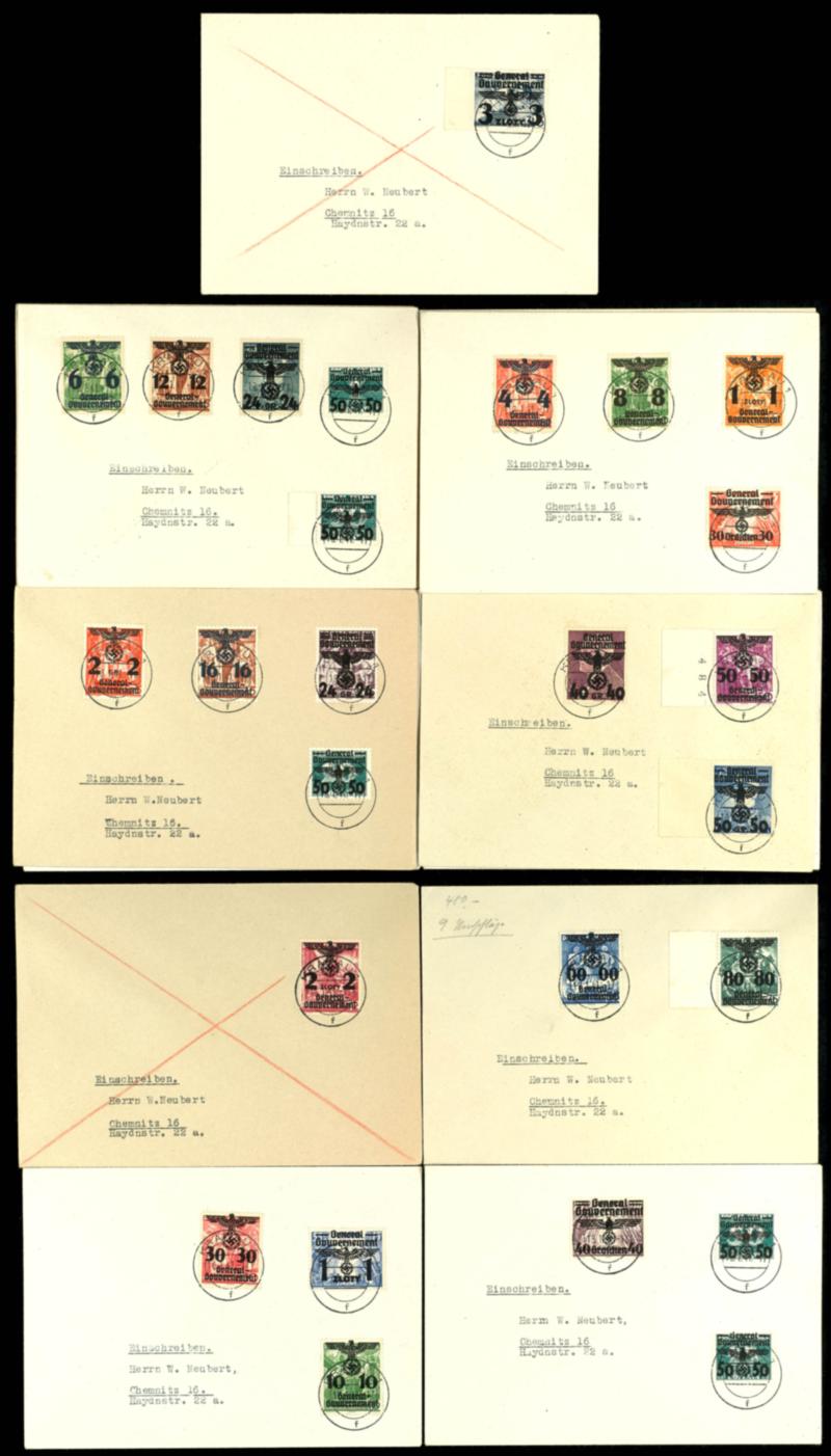 5 H. to 30 H. national coat of arms and 40 H. to 1 Kc. heads each with hand stamp overprint "we are free! plus swastika", faultless letter pieces with special cancel "post office Maffersdorf birth place Kurt Henleins eighth of October. 1938", edition 400 sets, mostly signed, number 22 photo expertiz