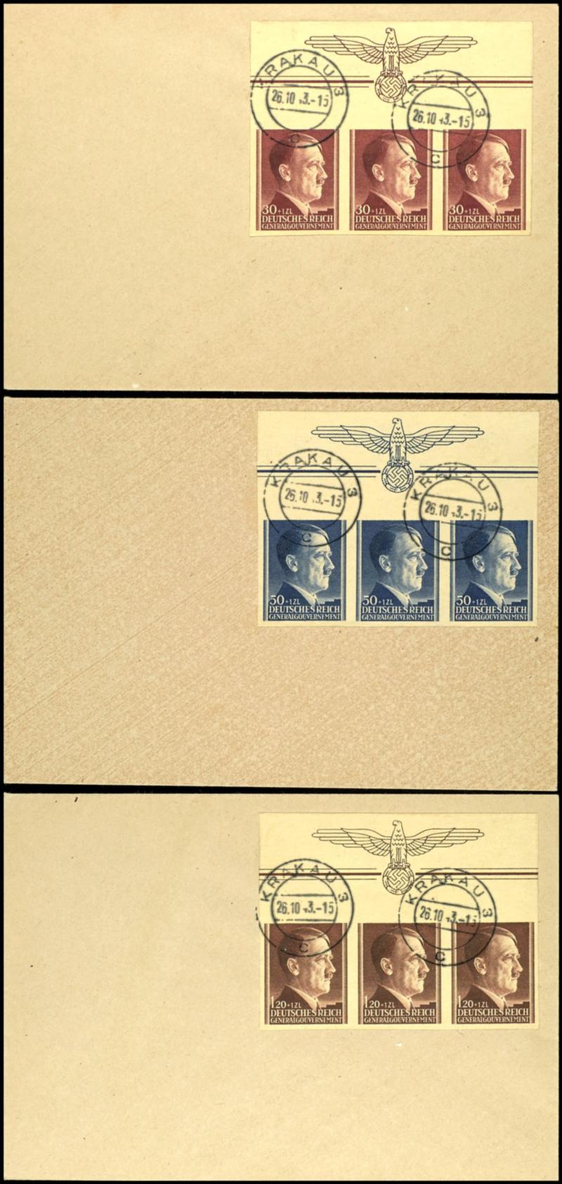 1, 20 Kr. to 10 Kr. landscapes with overprint "we are free! plus swastika", 2 Kc. Blade mountain in a-colour, 11 complete, each with special cancel "post office Maffersdorf birth place Kurt Henleins eighth of October. 1938" on pieces, edition 350 sets, isolates minimal brown perf tips, expertized Dr