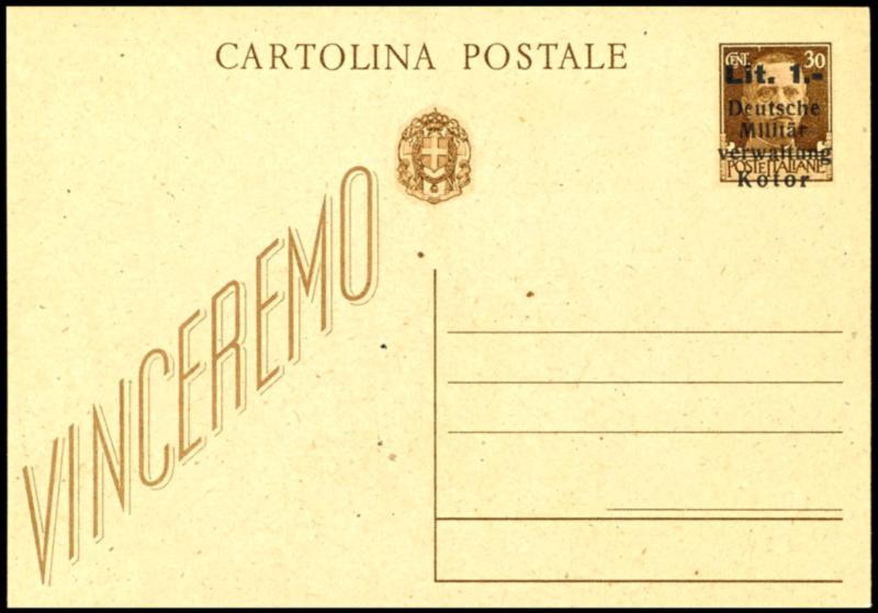 0, 50 plus 2 RM on 2 liras postal stamp, overprint flaw I "g in Montenegro normal standing" - only on a field in the sheet occurring (all the others fields shows a to small g), unused with original gum, very fine, photo expertize Robert Brunel VP (2024) "the condition is perfect. ", Michel 120.- (35