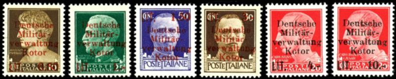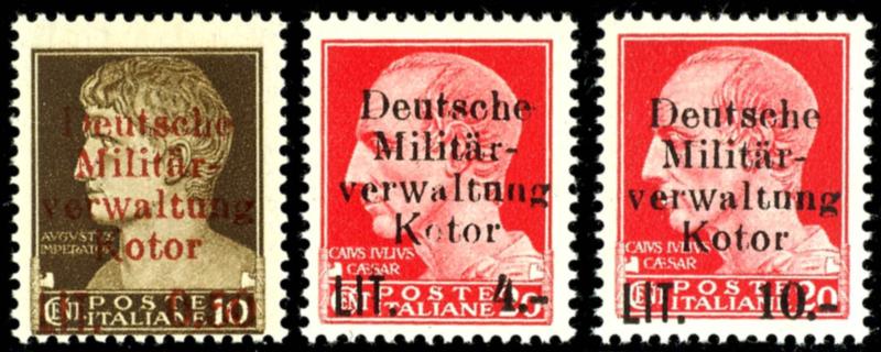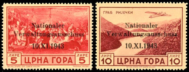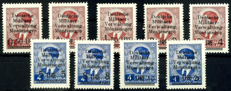 0, 15 plus 0, 85 RM on 3 Din to 0, 50 plus 1, 50 RM on 2 liras "Refugee Aid Montenegro", Michel number 25 with overprint flaw III "notched 5", complete set with nine values, mint never hinged, very fine, unsigned, photo expertize Robert Brunel VP (2016) "the condition is perfect. ", Michel 664.- (20