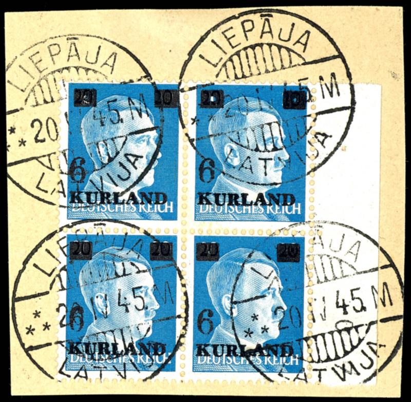 6 on 20 Pfg Hitler, block of four with the overprint type I (2), II and VI, cancelled "Liepaja Latvija / L" on piece, photo expertize Brunel VP (2020) "the cancellation is made for philatelic purposes. the condition is perfect. ", Michel 156.- (3(2)/3II/3VI) (page)
