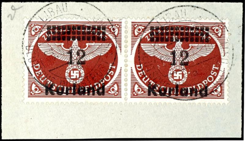 12 on field post parcel approval stamp, perforated, horizontal pair, cancelled "Libau German offical postal service / a", photo expertize Brunel VP (2020) "the cancellation is made for philatelic purposes. the condition is perfect. ", Michel 180.- (4A(2)) (page)