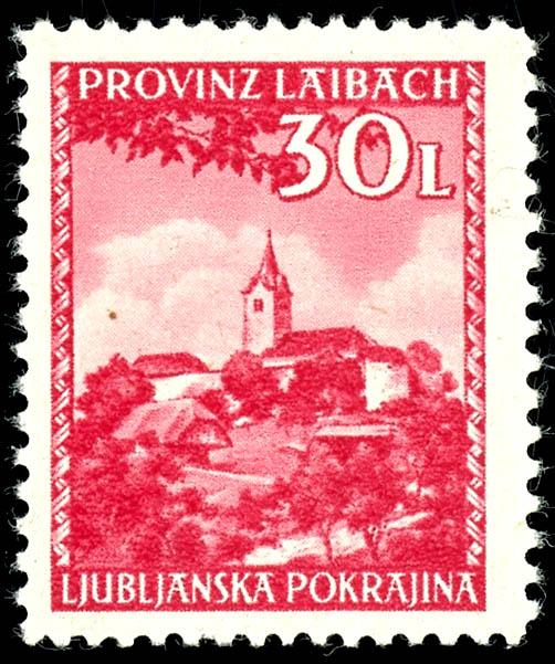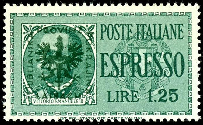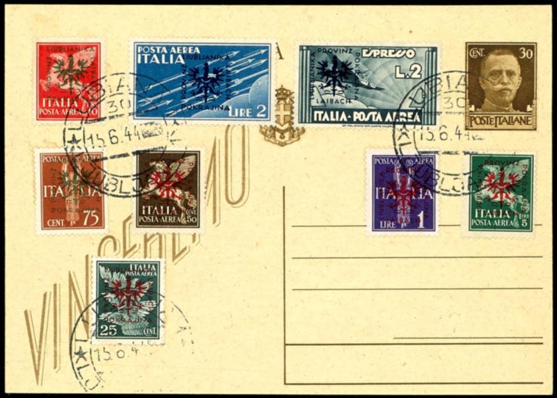 25 Centesimi to 10 liras airmail, complete set with nine values, cancelled "LUBIANA 1 * LLJUBLANA 1 30 15.6.44" on postcard form, very fine, photo expertize Gerhard Krischke "the condition is perfect. used are these stamps rare. ", Michel 1.100.- (21/28) (page)