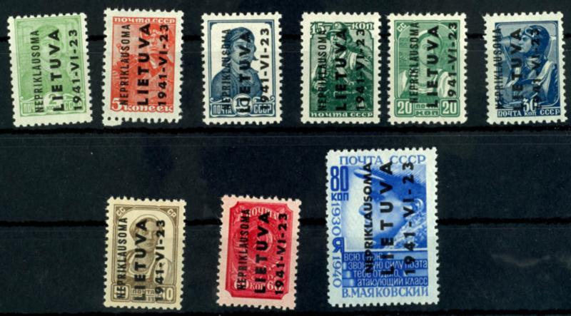 2 Kopecks to 80 Kopecks postal stamps with black typography overprint "NEPRIKLAUSOMA / LIETUVA / 1941 - VI - 23", complete set with nine values, mint never hinged, very fine, Michel 230.- (1/9) 2 Kopeken bis 80 Kopeken Freimarken mit schwarzem Bdr.-Aufdruck "NEPRIKLAUSOMA / LIETUVA / 1941 - VI -