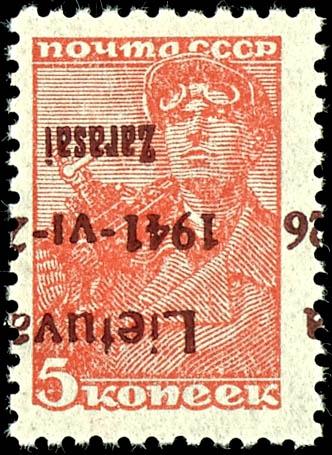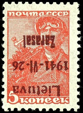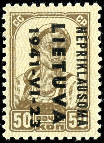 50 Kopecks postal stamp with black typography overprint "NEPRIKLAUSOMA / LIETUVA / 1941 - VI - 23", variety "inverted overprint", mint never hinged, very fine, expertized wild boar, Krischke BPP and photo expertize Rainer Bender BPP "the condition is perfect. ", Michel 200.- (7K) (page)