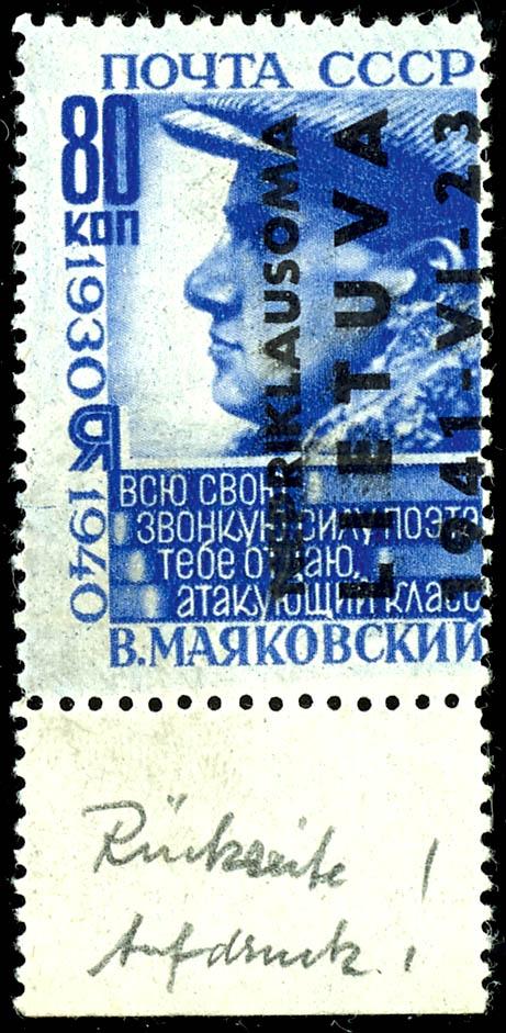 80 Kop. national issue with overprint "NEPRIKLAUSOMA / LIETUVA 1941 - VI - 23", variety "double overprint on the front- and reverse side", mint never hinged, reverse under UV small mould stain visible, the stamp causes in total not fresh and soiled, photo expertize Thilo Nagler VP, Michel 3.500.- (9