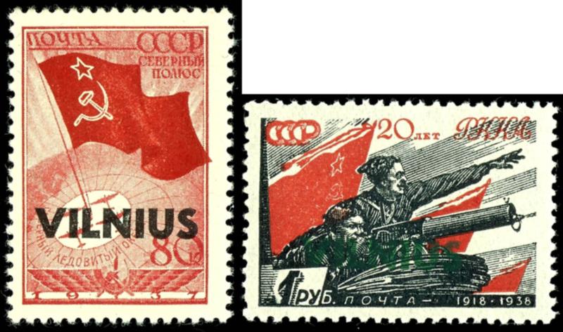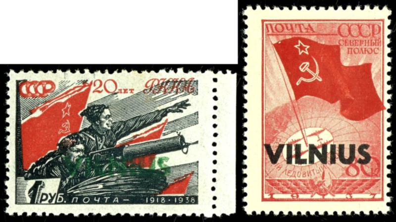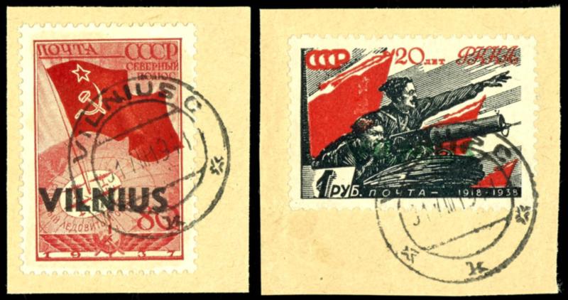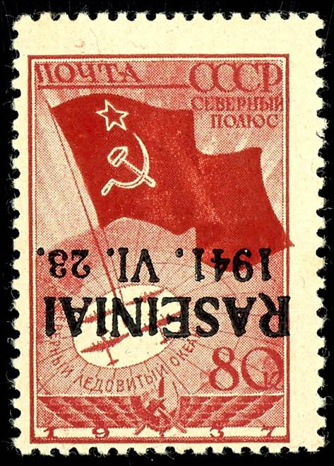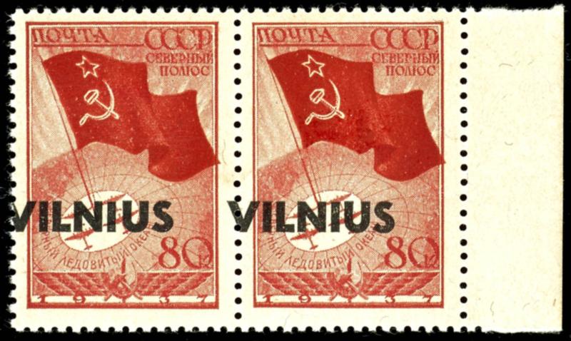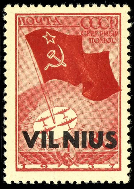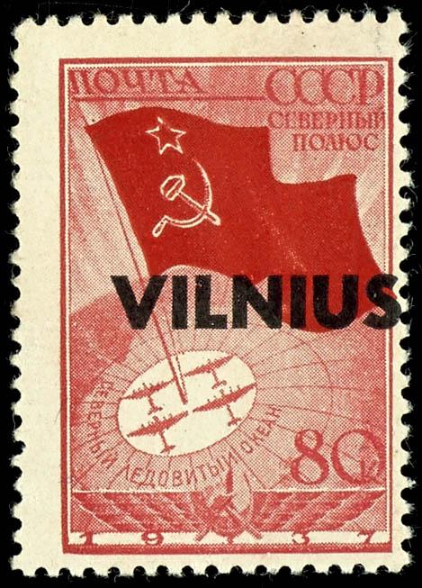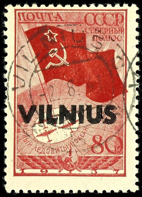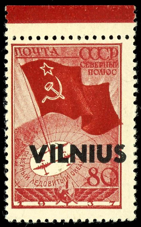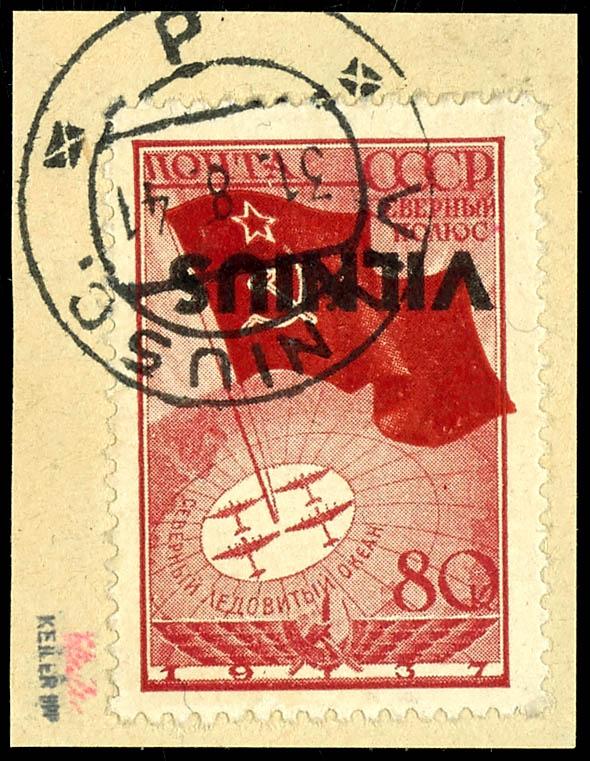 80 Kopecks "North pole flight" with black typography overprint "VILNIUS", used, very fine, expertized Krischke, Michel 300.- (17) 80 Kopeken "Nordpolflug" mit schwarzem Bdr.-Aufdruck "VILNIUS", gestempelt, tadellose Erhaltung, geprüft Krischke, Mi. 300.-