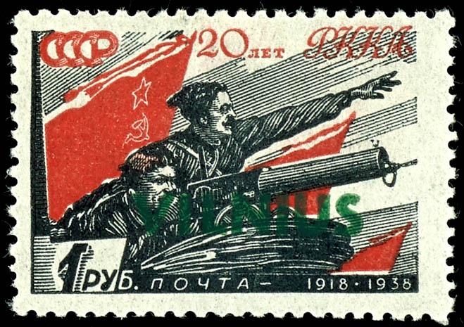 1 Rouble "20 years red army / Wasilij Tschapajew" with green overprint "VILNIUS", mint never hinged, very fine, unsigned, photo copy of a certificate Gerhard Krischke BPP (for former block of four) "genuine and immaculate", Michel 2.750.- - in this good perforation and without any signature very rar