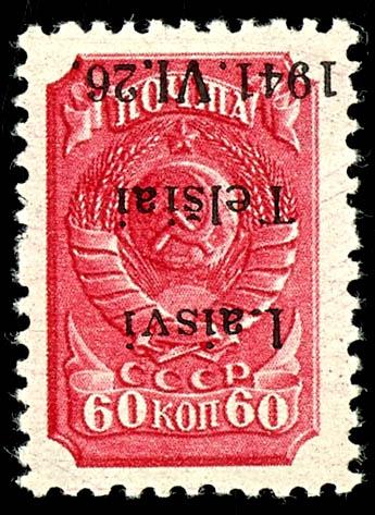 50 Kopecks postal stamp with black typography overprint "NEPRIKLAUSOMA / LIETUVA / 1941 - VI - 23", variety "inverted overprint", mint never hinged, very fine, expertized Krischke BPP (double signature), Michel 200.- (7K) 50 Kopeken Freimarke mit schwarzem Bdr.-Aufdruck "NEPRIKLAUSOMA / LIETUVA /