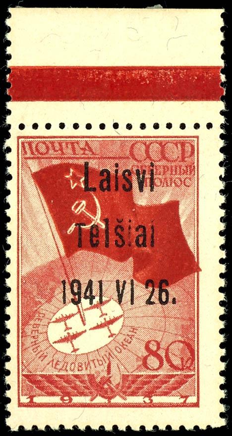 80 Kopecks postal stamp with black typography overprint "Laisvi Telsiai 1941. VI. 26" in type IIb I the 2nd issue, upper margin copy, overprint field 9, overprint flaw XIII "1 instead of l in Telsiai", mint never hinged, very fine, unsigned, photo expertize Thilo Nagler VP "genuine and immaculate. "