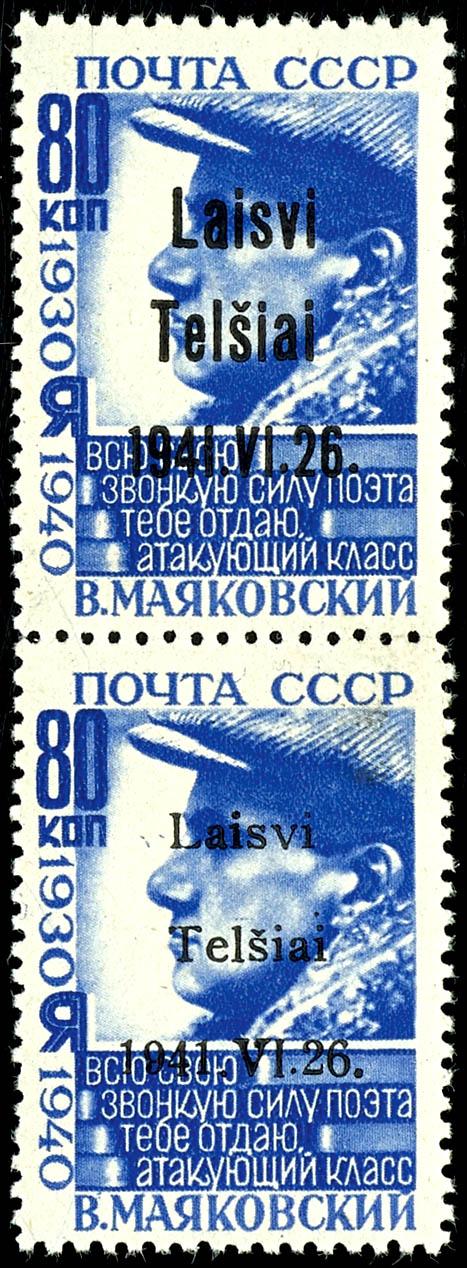 80 Kopecks postal stamp "Majakowski" with black typography overprint "Laisvi Telsiai 1941. VI. 26" in type I and III, vertical pair of overprint types from the fields 12 and 22, as usual slightly on folded, mint never hinged, very fine, issued only 80 pairs of this kind of these the largest part sur