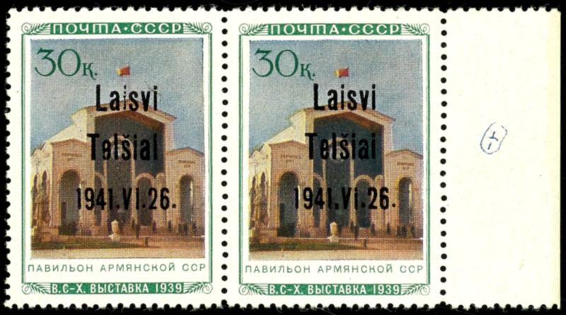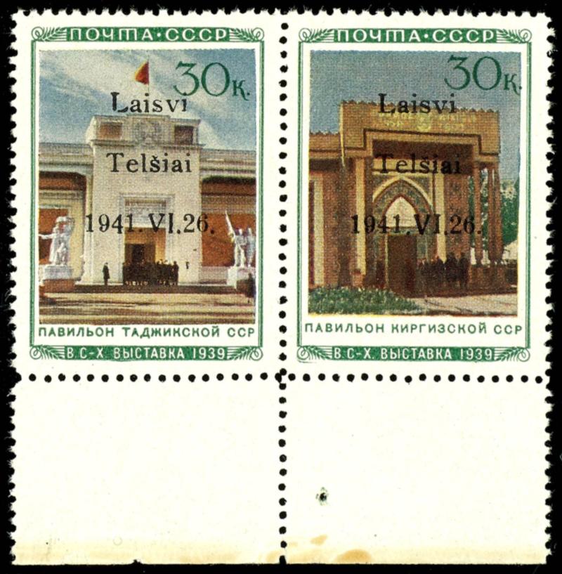 30 Kopecks special stamp "agriculture exhibition - pavilion Tajik SSR" and 30 Kopecks "agriculture exhibition - pavilion Kyrgyz SSR" each with three line overprint "Laisvi / Telsiai / 1941. VI. 26" in type I the 2nd issue, horizontal se-tenants position 33 and 34, mint never hinged, very fine, unsig