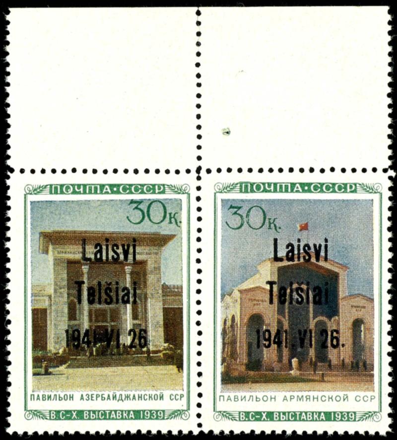 30 Kopecks special stamp "agriculture exhibition - pavilion Azerbaijan SSR" and 30 Kopecks "agriculture exhibition - pavilion Armenian SSR" each with three line overprint "Laisvi / Telsiai / 1941. VI. 26" in type IIIb the 2nd issue, horizontal se-tenants position 3 and 4, mint never hinged, very fin