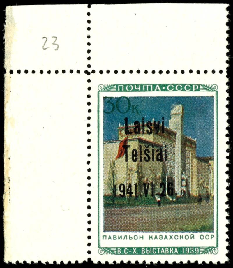 30 Kopecks special stamp "agriculture exhibition - Kazakh SSR" with black typography overprint "Laisvi Telsiai 1941. VI. 26" in type IIIb the 2nd issue, overprint flaw XXXII "l in Telsiai broken", corner margin piece top left, mint never hinged, very fine, issued only 40 examples, unsigned, photo ex