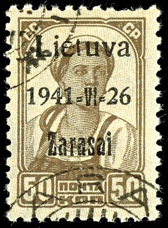 50 Kopecks postal stamp "workers" with black overprint "Lietuva / 1941 - VI - 26 / Zarasai" in type IIB, printing field 18, used, perf shortenings above - beyond that very fine, expertized Krischke BPP among others as well expertise Thilo Nagler VP (2024), Michel - . (6aIIB) (page)