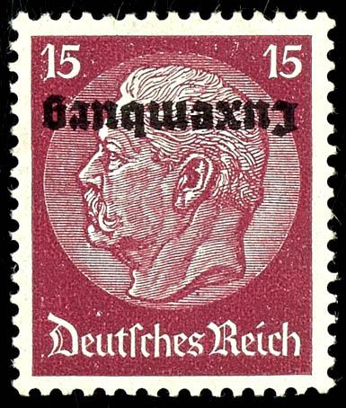 15 pfennigs Hindenburg with overprint "Luxembourg", variety "double overprint, of it a inverted, the other normal standing in the blind printing", mint never hinged, very fine, scarce variety, issued only 1 sheet = 100 piece, expertise Lothar Herbst VP (2025) "the condition is perfect. ", Michel 2.0
