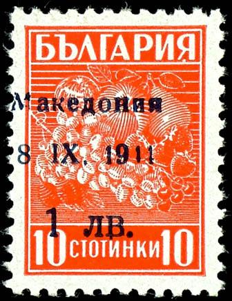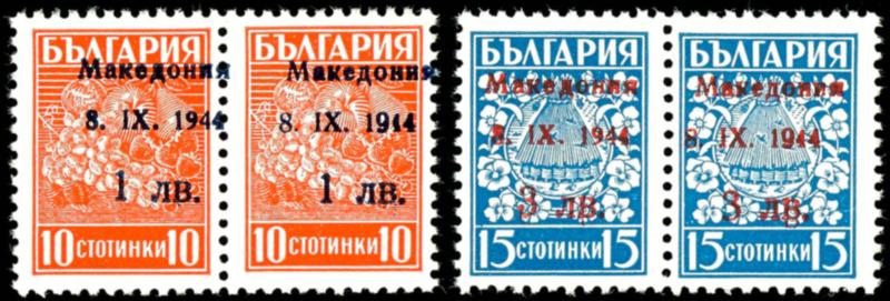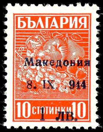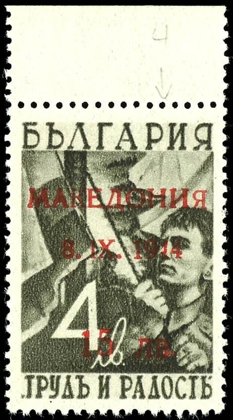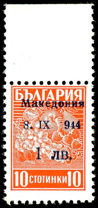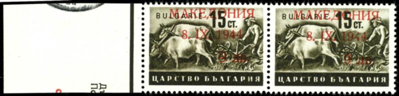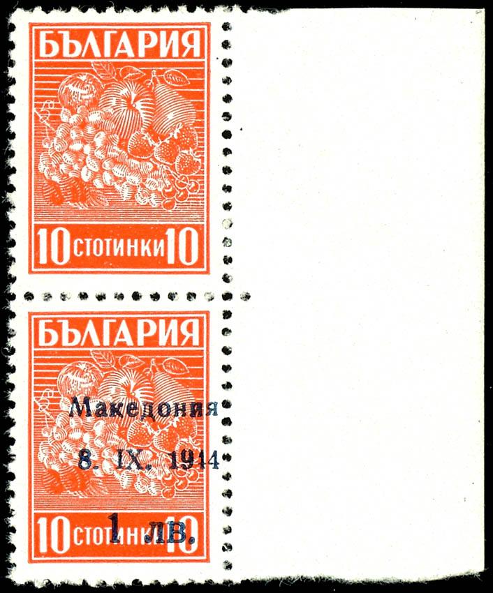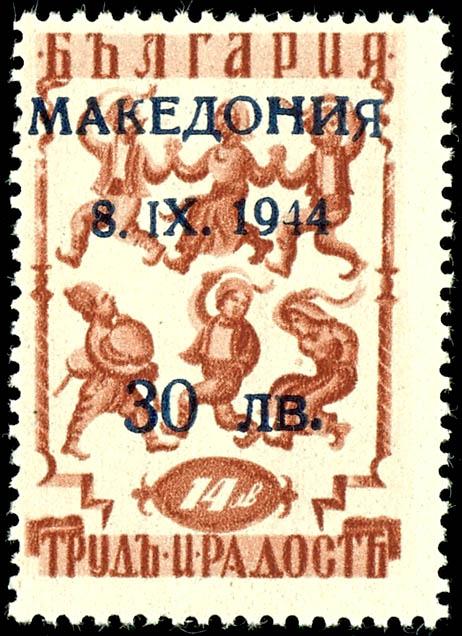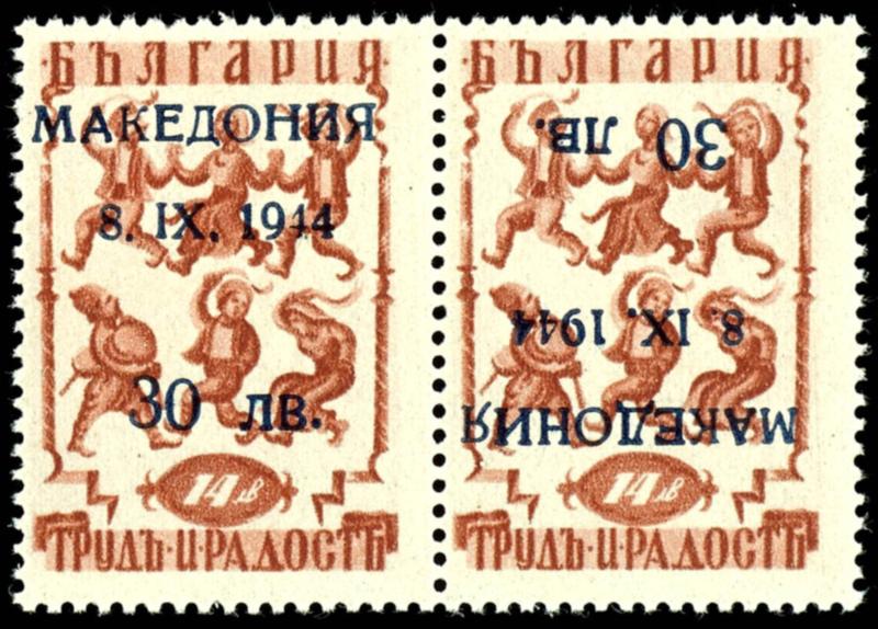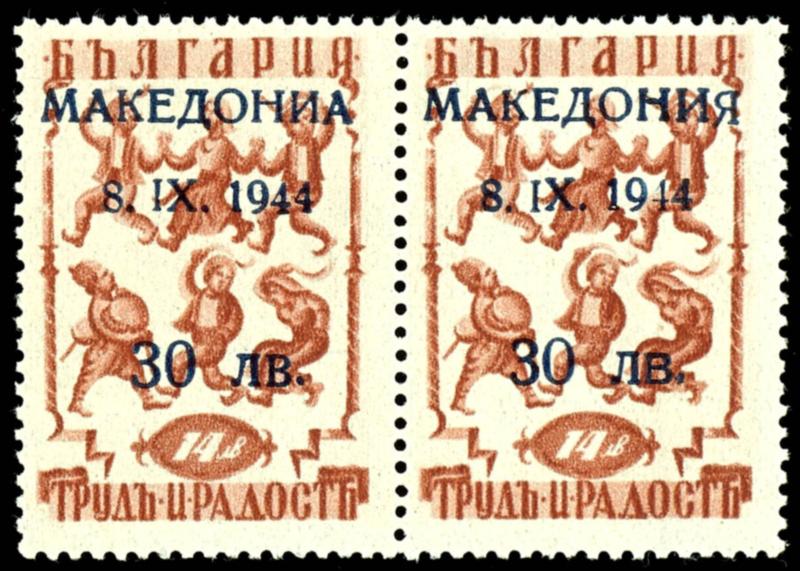 30 levs on 14 levs postal stamp with overprint in type I, overprint flaw VII "composition error Arabian A instead of Cyrillic R in the word MAKEDONIA" (field 19), horizontal pair with normal stamp, mint never hinged, very fine, unsigned, photo expertize Robert Brunel VP "the condition is perfect. ",
