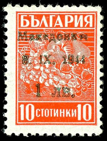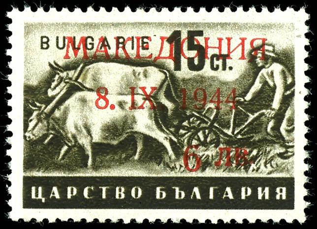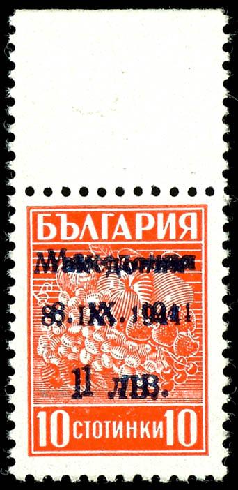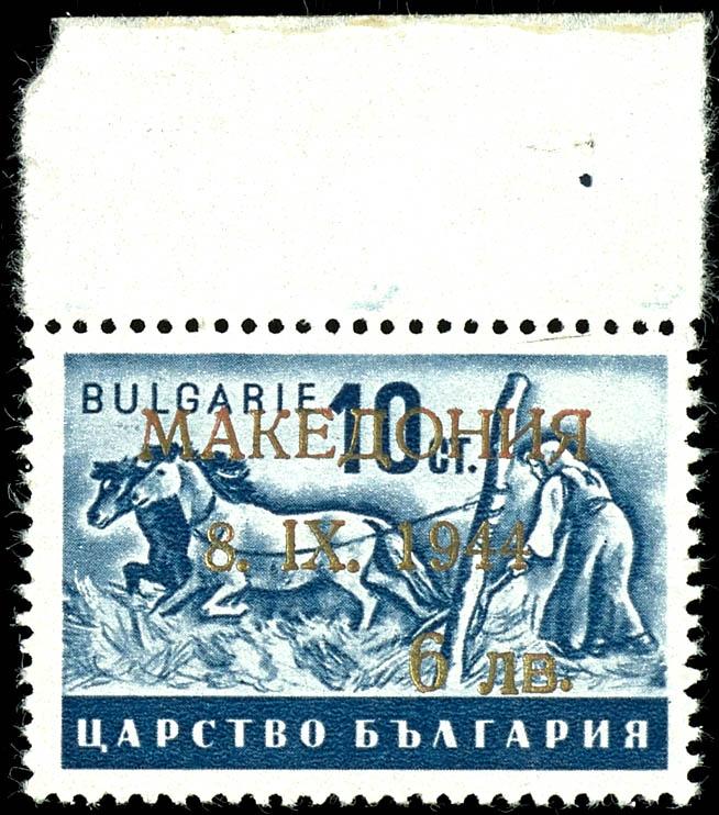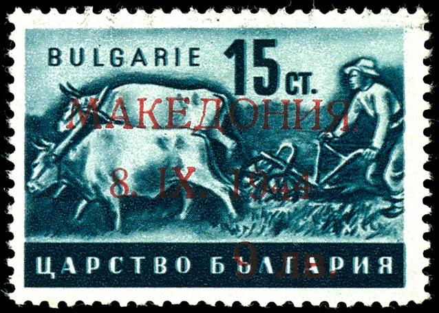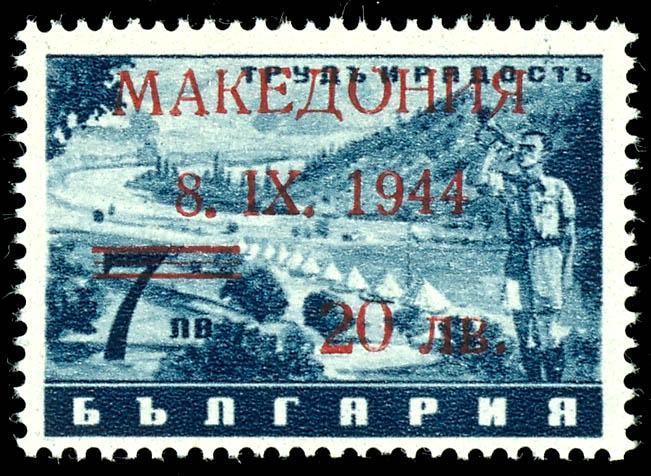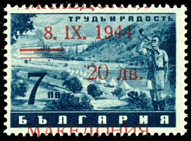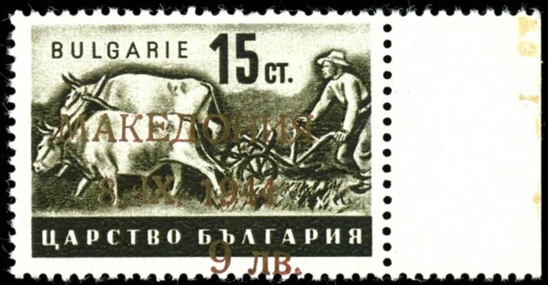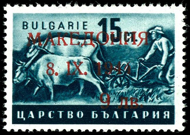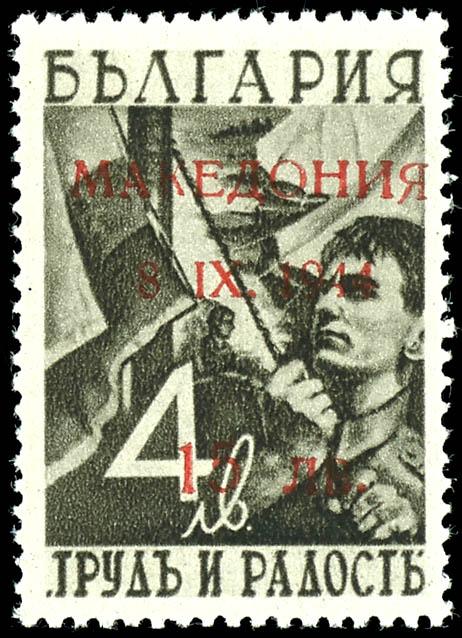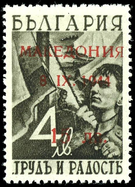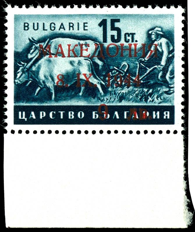9 levs on 15 Stot. postal stamp with overprint in type II, overprint flaw V "second 4 in 1944 open" (field 13), mint never hinged, very fine, expertized Krischke BPP and photo expertize Uwe Kleymann BPP "the condition is perfect. ", Michel 200.- (4V) (page)