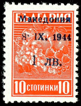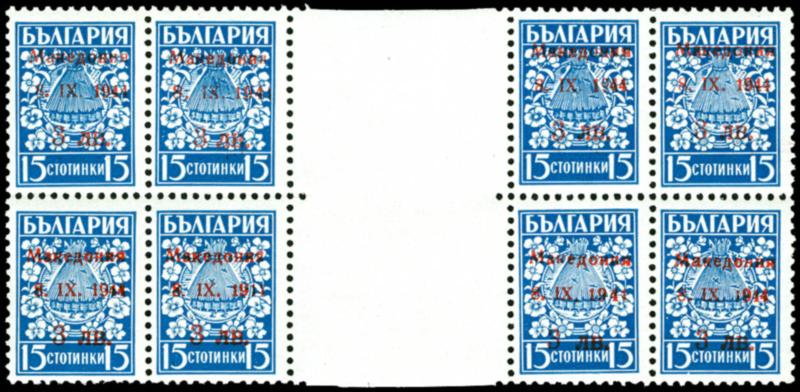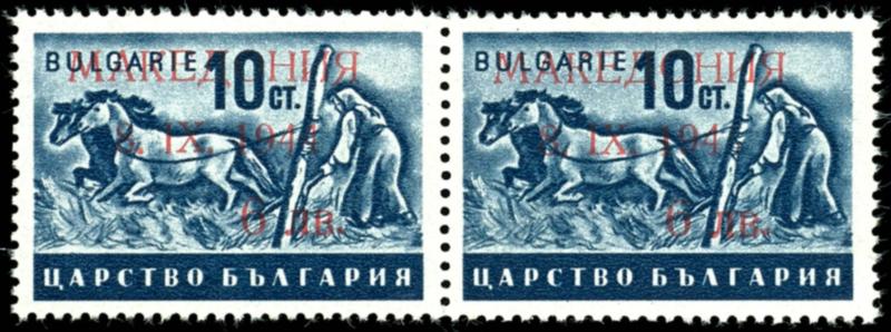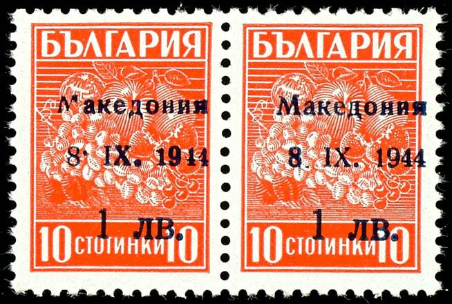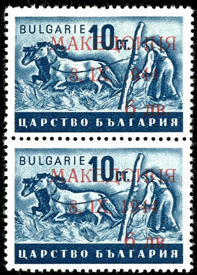6 levs on 10 Stot. postal stamp with overprint in type II, overprint flaw V "second 4 in 1944 open" (field 13), horizontal pair with normal stamp, mint never hinged, very fine, expertized Karaivanoff and photo expertize Robert Brunel BPP "the condition is perfect. ", Michel 200.- (3,3V) (page)