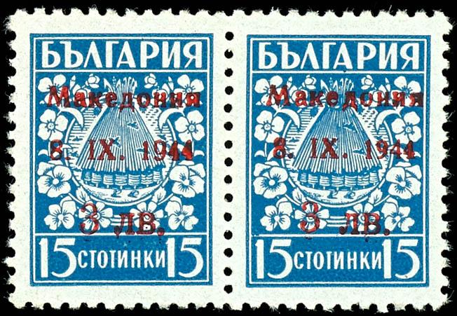 9 levs on 15 Stot postal stamp with overprint in type II, overprint flaw IV "first 4 in 1944 open" (field 22), horizontal pair with normal stamp, mint never hinged, very fine, signed, photo expertize Robert Brunel BPP "the condition is perfect. ", Michel 143.- (5/5IV) (page)