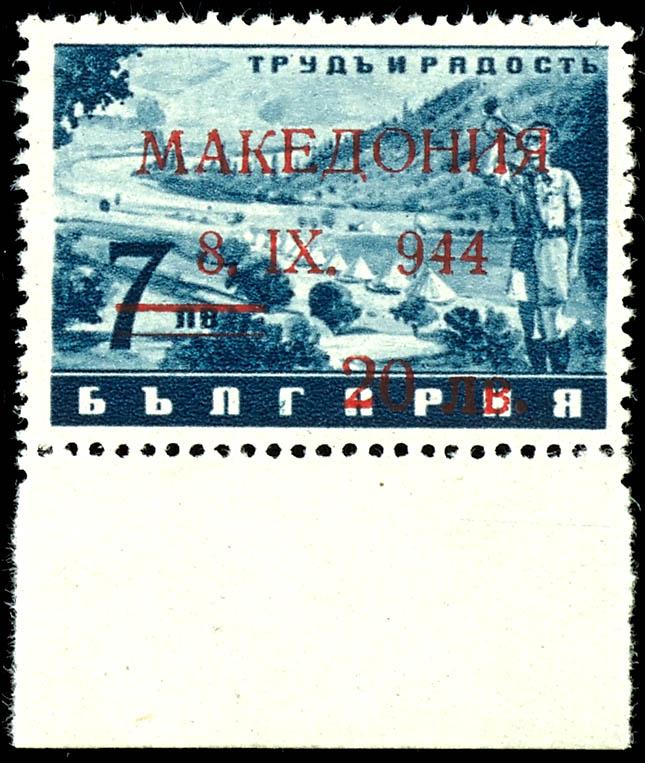 20 levs on 7 levs postal stamp with overprint in type II, overprint flaw VII "indication of value the numeral 7 only twice bared" additional is absent here the 1 from 1944, lower margin copy, mint never hinged, very fine, unsigned, photo expertize Uwe Kleymann BPP "the condition is perfect. ", Miche