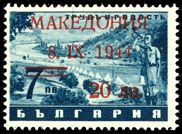 20 levs on 7 levs postal stamp with overprint in type II, overprint flaw IX "O in MAKEDONIA above open" (field 68), mint never hinged, very fine, unsigned, photo expertize Uwe Kleymann BPP "the condition is perfect. ", Michel 500.- (7IX) (page)