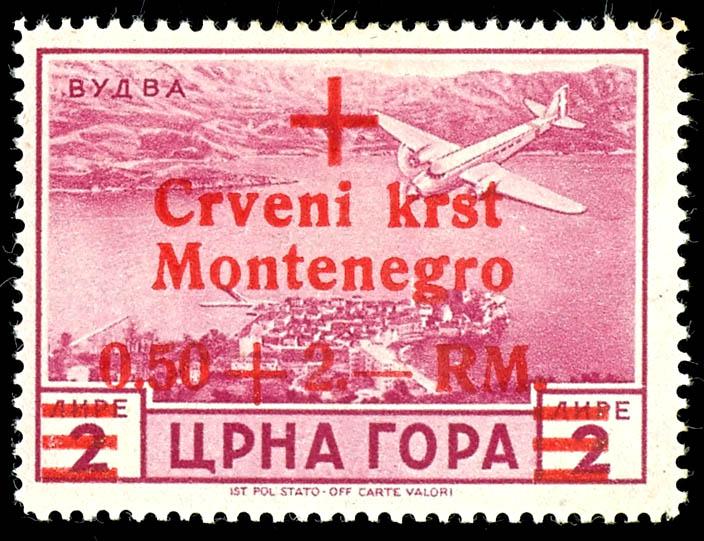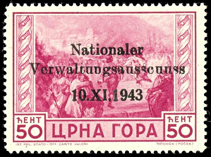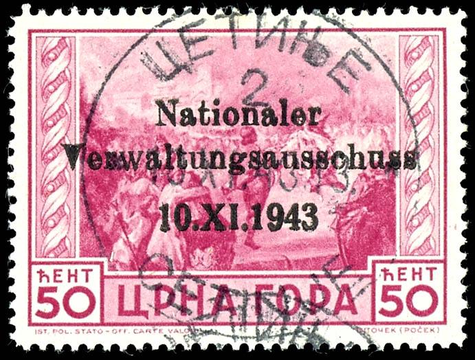50 C. airmail stamp, cancelled "Cetinje 2 * 10. XI. 43 *" - CTO on the founding day of the management committee dated, the stamp appeared first at the 9. December 1943, photo expertize Brunel BPP (2010) "the condition is perfect. ", Michel 120.- (11) (page)