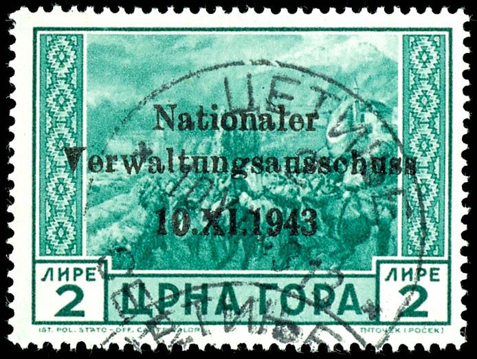 2 liras airmail stamp, cancelled "Cetinje 2 * 10. XI. 43 *" - CTO on the founding day of the management committee dated, the stamp appeared first at the 9. December 1943, photo expertize Brunel BPP (2010) "the condition is perfect. ", Michel 120.- (13) (page)
