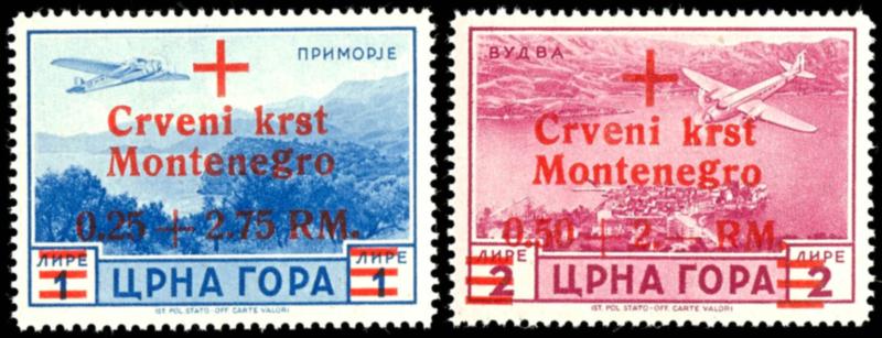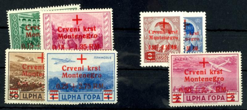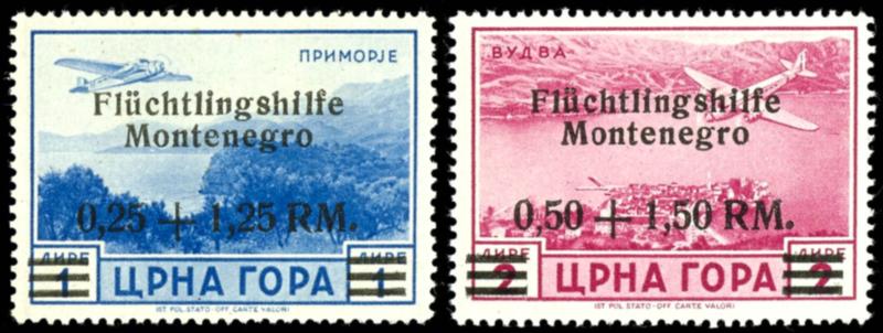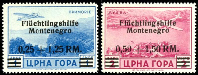 0, 15 plus 0, 85 RM on 3 Din to 0, 50 plus 1, 50 RM on 2 liras "Refugee Aid Montenegro", complete set with 9 values, mint never hinged, very fine, partly expertized Krischke BPP, Michel 660.- (20/28) 0,15 + 0,85 RM auf 3 Din bis 0,50 + 1,50 RM auf 2 Lire "Flüchtlingshilfe Montenegro", kompletter