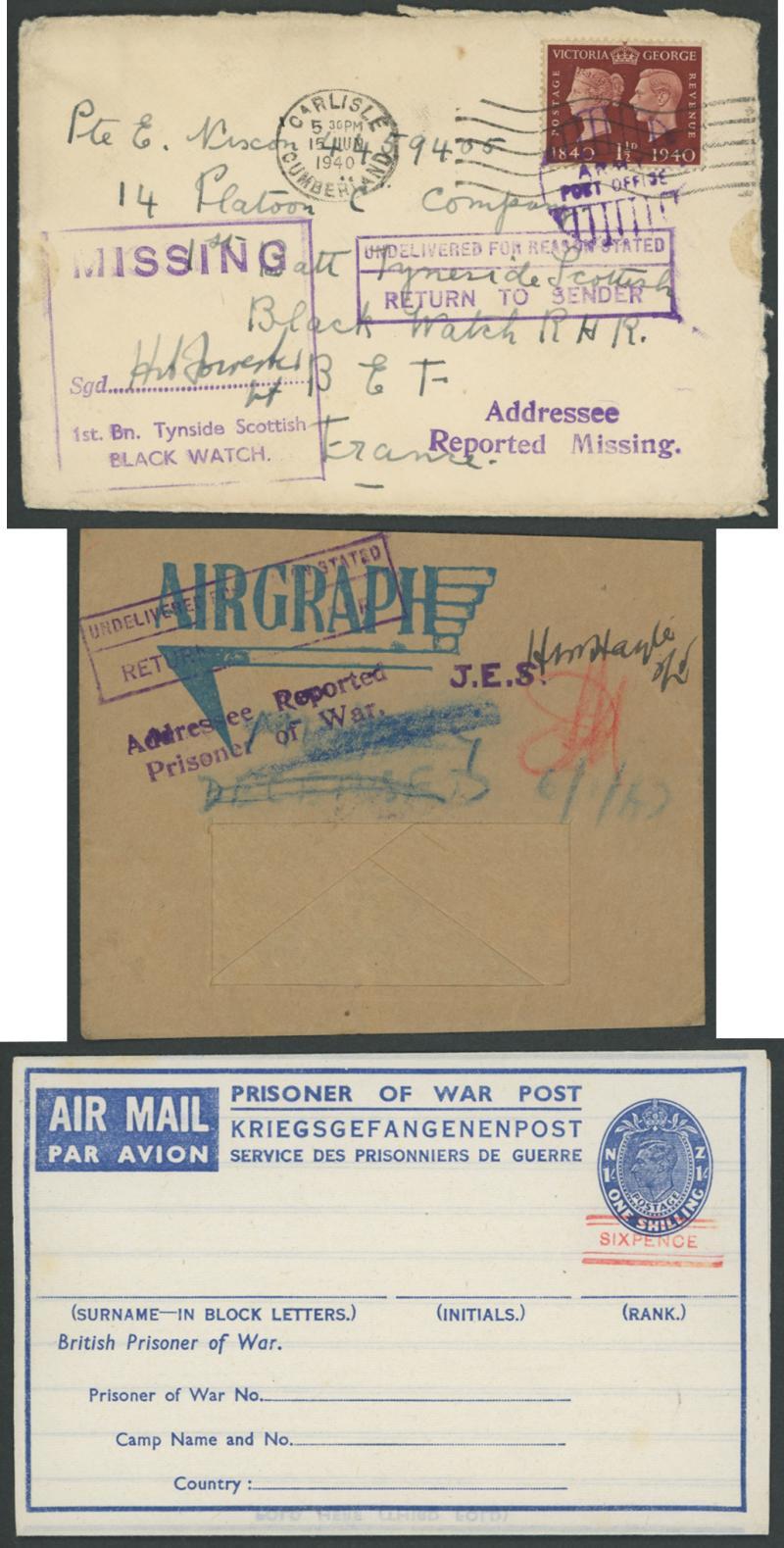 COVERS: World War II Prisoner of War mail mostly on annotated pages from Great Britain including two different huge 'MISSING' cachets, 3d Airmail Postal Card to Formosa, 2½d Aerogrammes x2 to Germany with '...UNDELIVERED MAILS...' or '...RETURNED BY THE SWISS POST OFFICE...' backstamps, cover with s