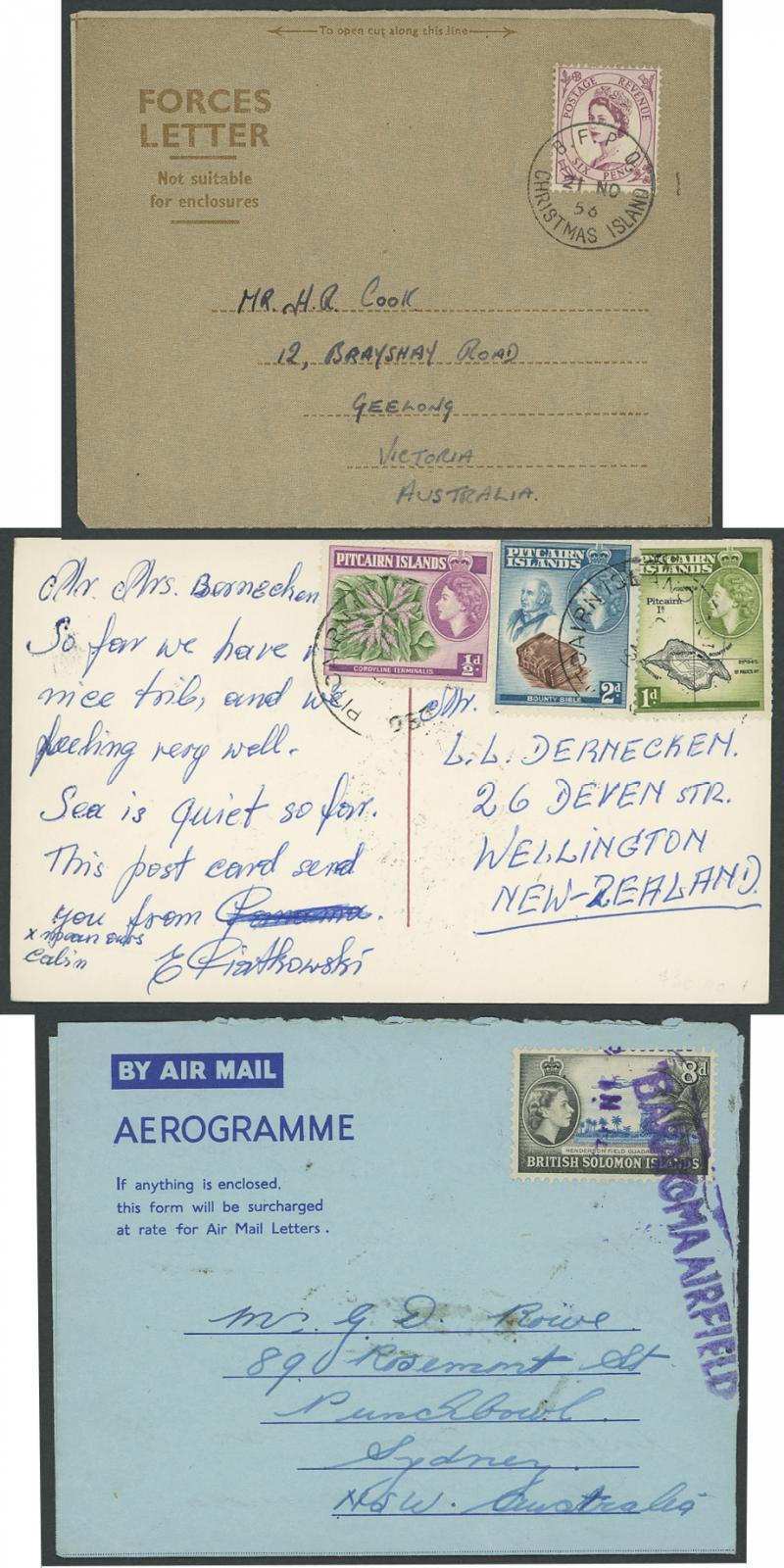 COVERS: Pacific Islands mostly philatelic covers from Pitcairn including FDCs from 1949 UPU to modern but with commercial/social mail including several from British Forces on Christmas Island (one at 6d double-rate, and one a very scarce use of formular Forces Letter to Australia via Hong Kong!) and