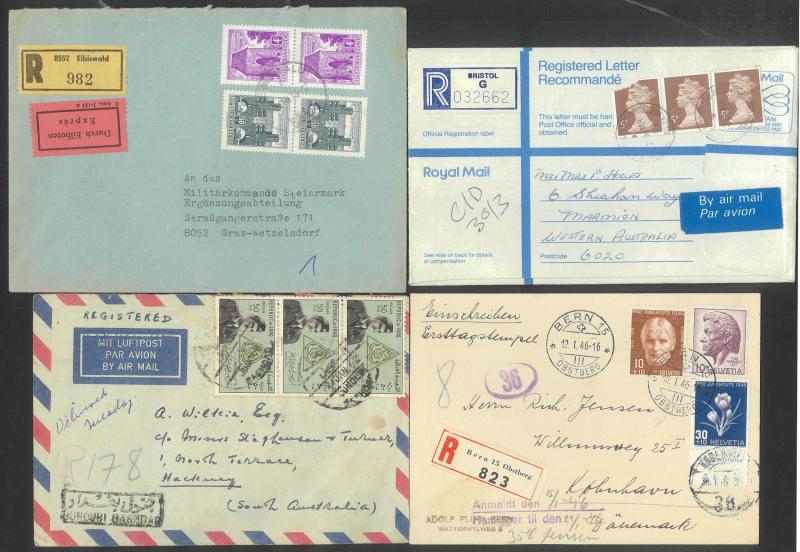REGISTRATION LABELS: Worldwide accumulation many on pages & hagners but mostly in packets by country & loose (many 1000s); also a batch of mostly Austrian 1970s registered covers from numerous small offices.