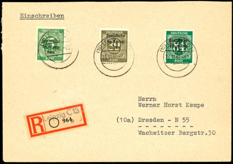 3 and 20 Pfg numerals with lower margin respectively corner margin lower left, 1 RM numerals with corner margin top right and 45 Pfg from right margin on registered advice of delivery letter LEIPZIG 20.8.46 to Wertheim, exactly properly franked with 168 Pfg, US-censorship and arrival 2.9.46, with co
