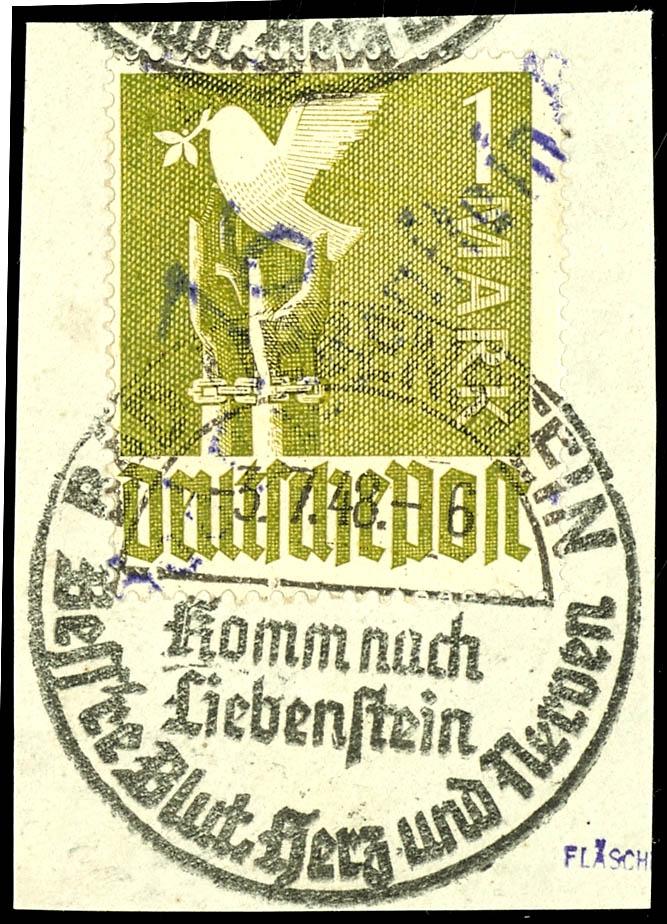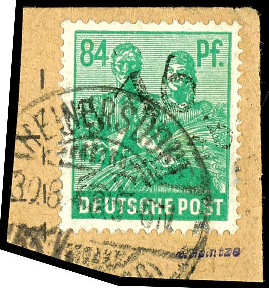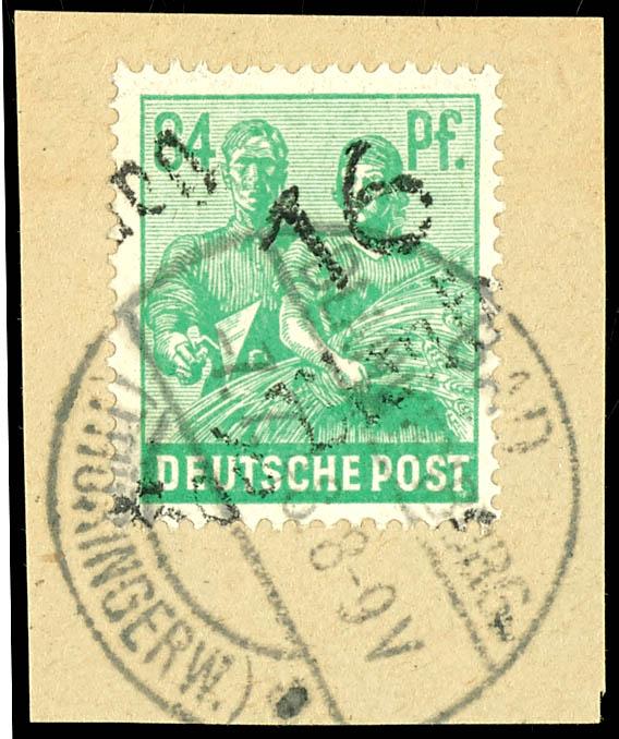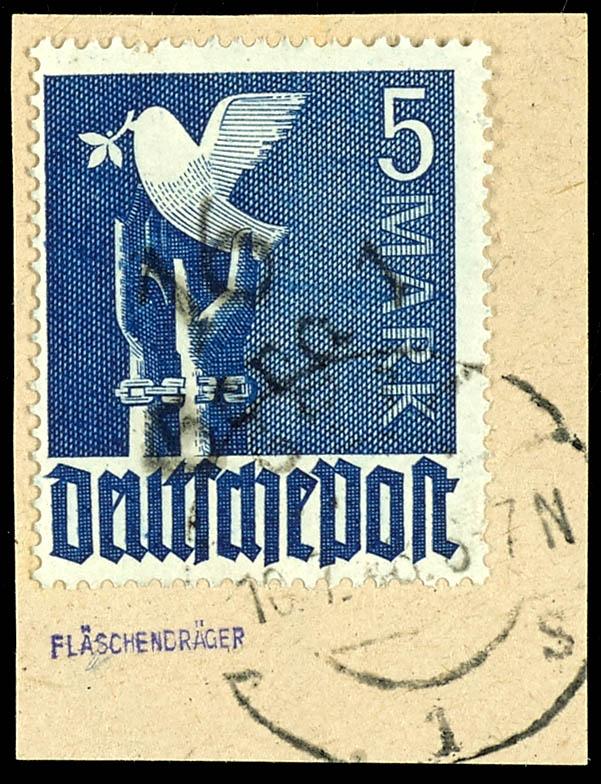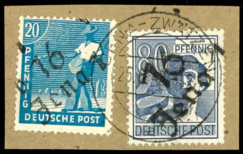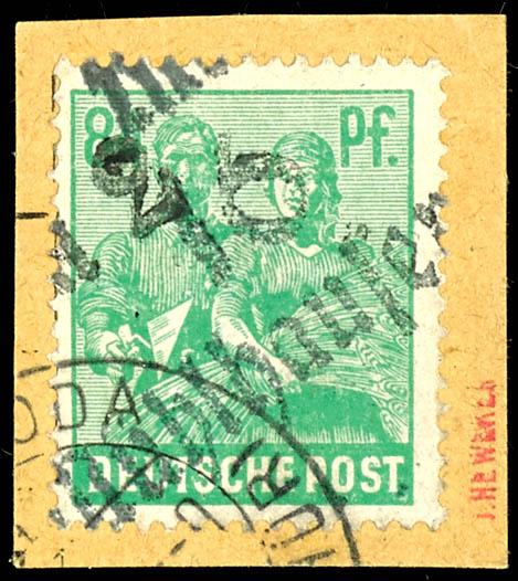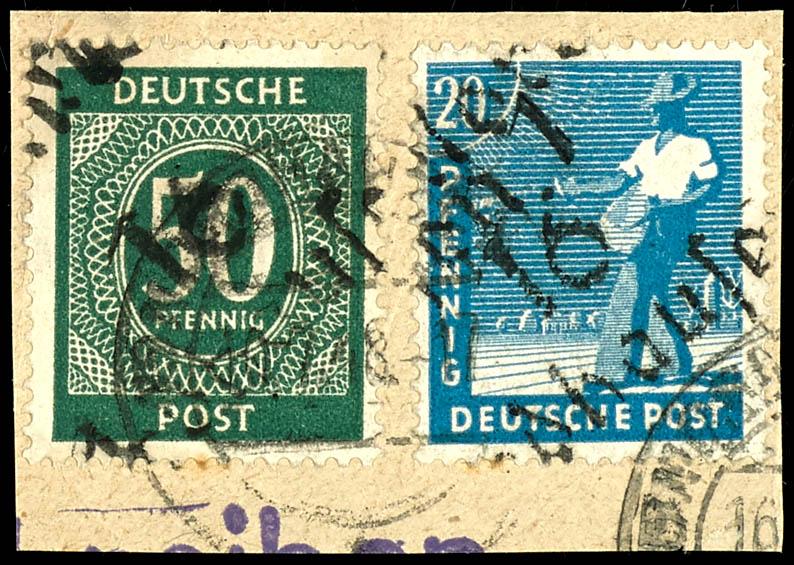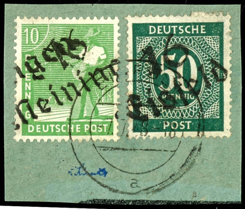 6 pfennigs numerals, black blue green, postmaster separation Loschwitz, with 5 pfennigs numerals on piece with cancellation "Dresden Loschwitz 24.1.46", very fine, expertized STROEH BPP, Michel 408, 50 (43Gb,42G) 6 Pfennig Ziffern, schwarzblaugrün, Postmeistertrennung Loschwitz, mit 5 Pfennig Zif