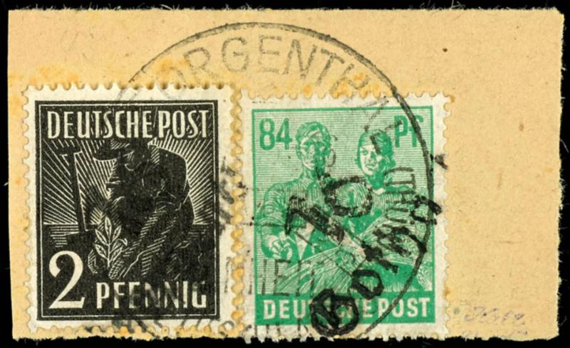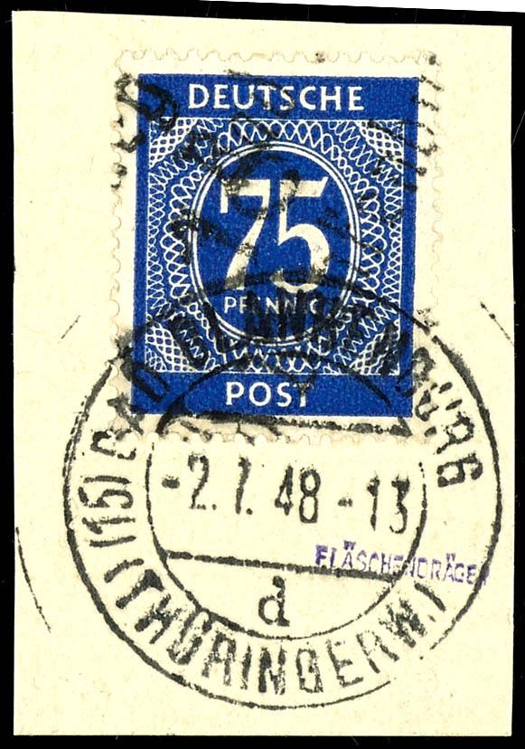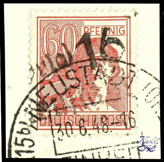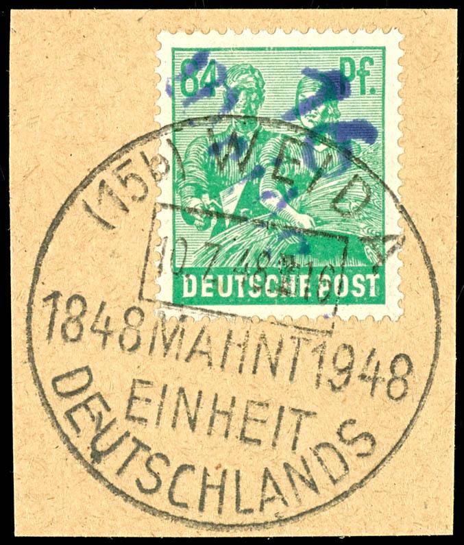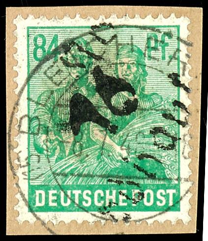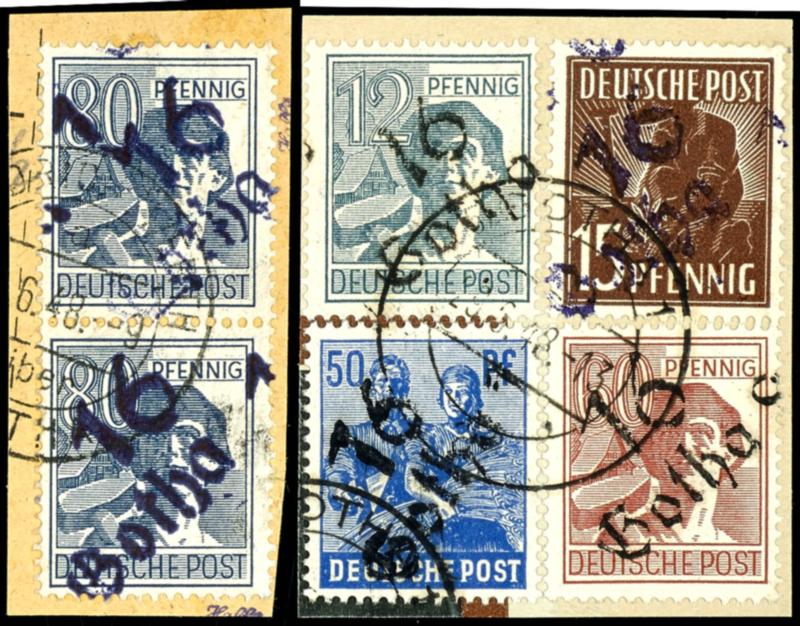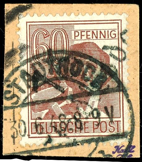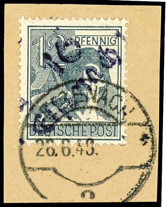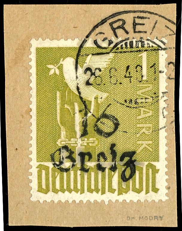 6 pfennigs numerals, black blue green, postmaster separation Loschwitz, with 5 pfennigs numerals on piece with cancellation "Dresden Loschwitz 24.1.46", very fine, expertized STROEH BPP, Michel 408, 50 (43Gb,42G) 6 Pfennig Ziffern, schwarzblaugrün, Postmeistertrennung Loschwitz, mit 5 Pfennig Zif