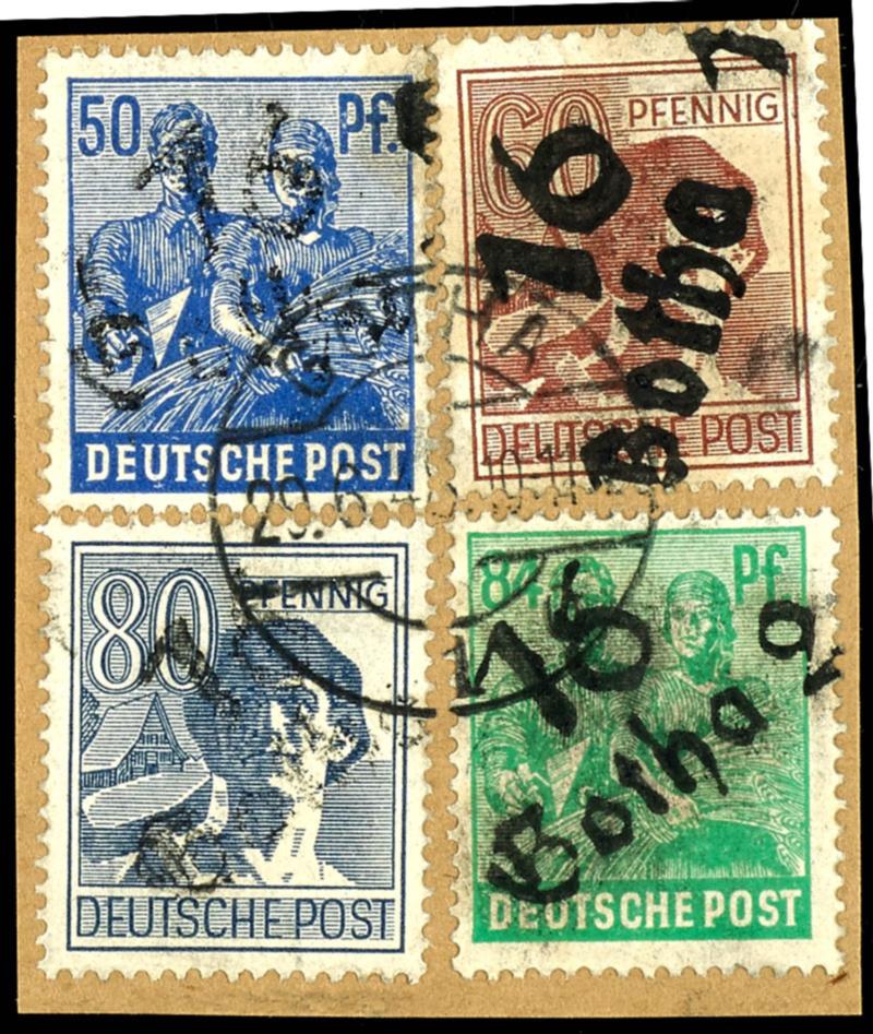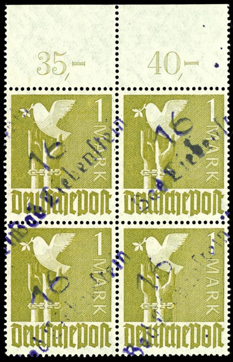 5 pfennigs to 40 pfennigs numerals with postmaster roulette Loschwitz, each as block of four, complete set with nine values, each on single letter pieces, in each case centric cancellation "DRESDEN-LOSCHWITZ 16.8.45", expertized Jasch BPP, Michel 480.- (42/50G(4)) 5 Pfennig bis 40 Pfennig Ziffern