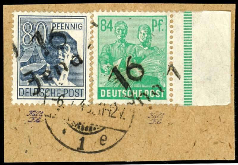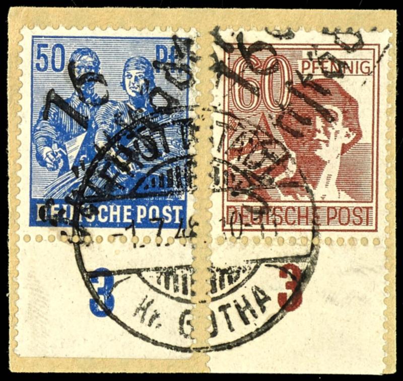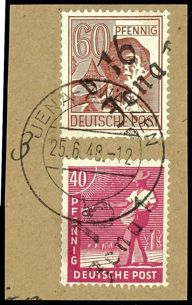 40 pfennigs with overprint 16 Jena 1 and 60 pfennigs with overprint 16 Jena 1 b, together on piece, perfect, study group group 9, expertized Wagner BPP, Michel / study group 160.- (177,A179III) 40 Pfennig mit Aufdruck 16 Jena 1 und 60 Pfennig mit Aufdruck 16 Jena 1 b, zusammen auf Briefstück, ein