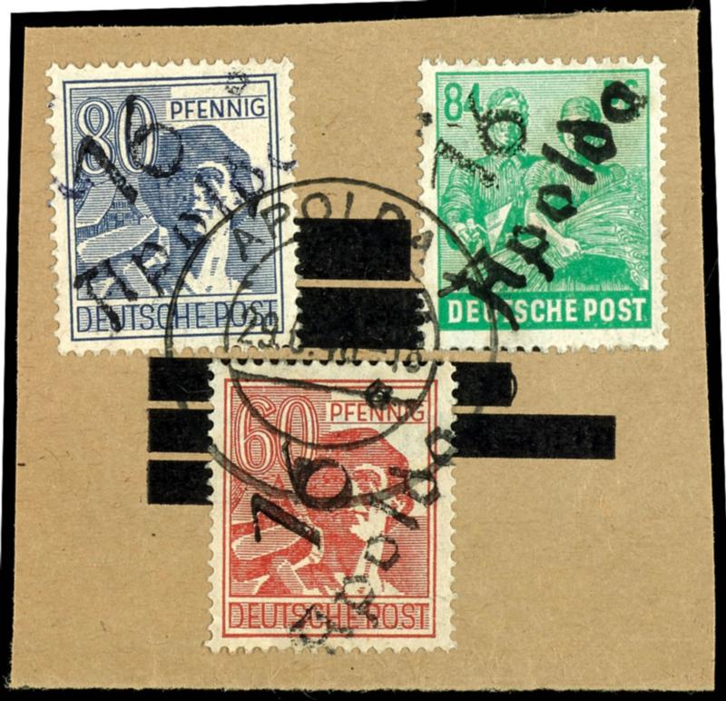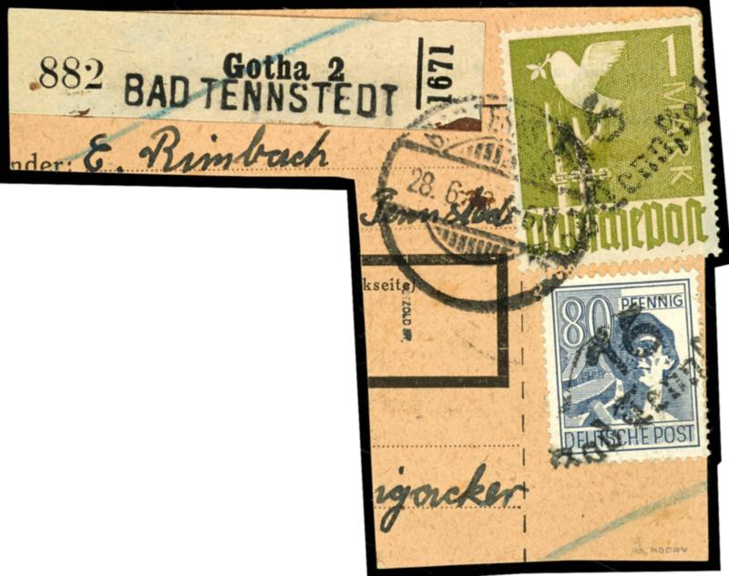 1 Mark as well 10 and 80 pfennigs with overprint 16 Bad Tennstedt, parcel card section, 10 pfennigs reverse, perfect, study group group 9, expertized Petzold BPP, Michel / study group 475.- (IIa,169,180III) 1 Mark sowie 10 und 80 Pfennig mit Aufdruck 16 Bad Tennstedt, Paketkartenabschnitt, 10 Pf