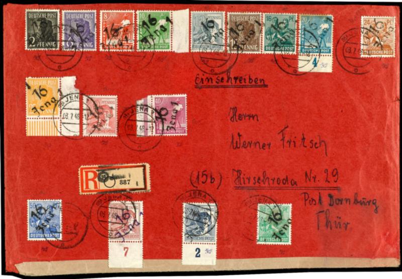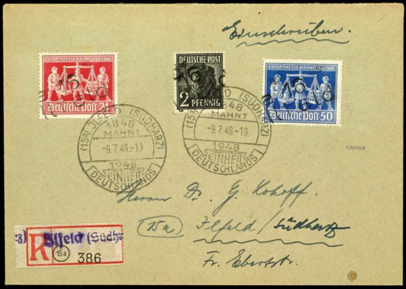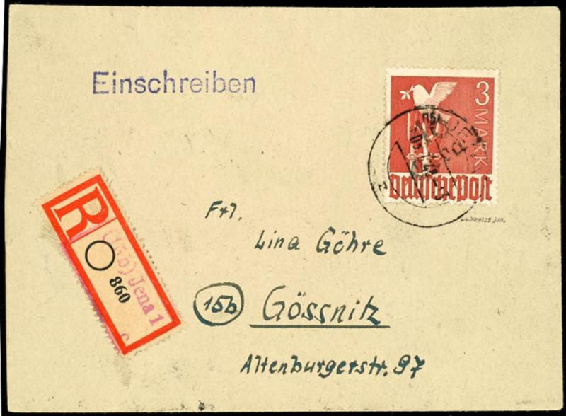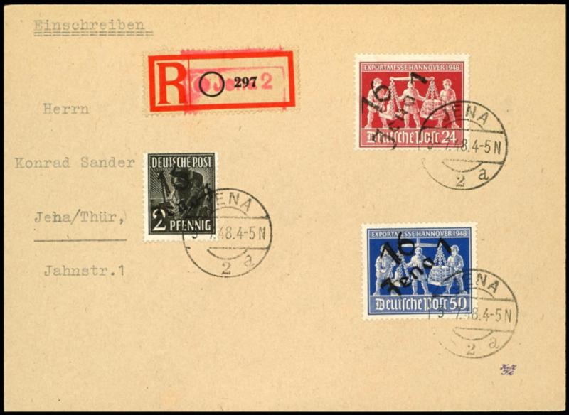 24 and 50 pfennigs Hanover fair as well 2 pfennigs with overprint 16 Jena 1, properly franked locality registered letter, perfect, expertized Wagner BPP, Michel 295.- (IVa,b,166III) 24 und 50 Pfennig Hannovermesse sowie 2 Pfennig mit Aufdruck 16 Jena 1, portorichtiger Ortseinschreibebrief, einwan